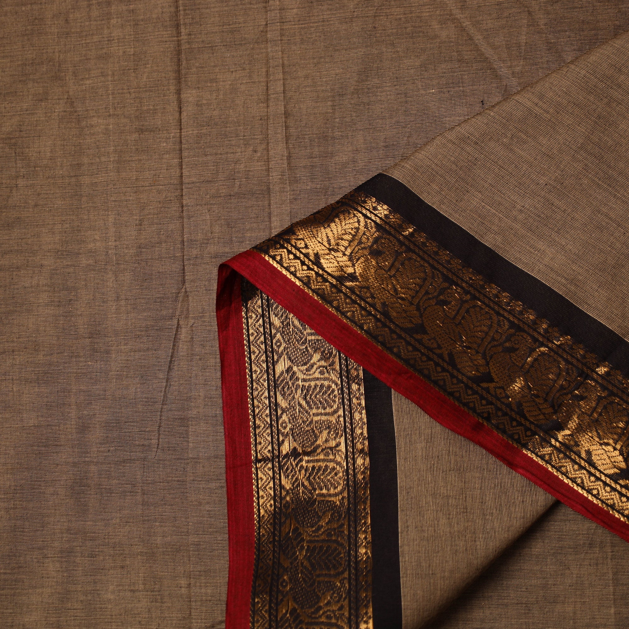 Fine-quality Kanchipuram cotton fabric with zari border from Kanchi, Tamil Nadu. Brilliantly woven fabric, Kanchi cotton is the glory of the city of Kanchipuram in Tamil Nadu. Perfect for making elegant sarees, dresses, and ethnic wear, it effortlessly blends tradition with contemporary style.