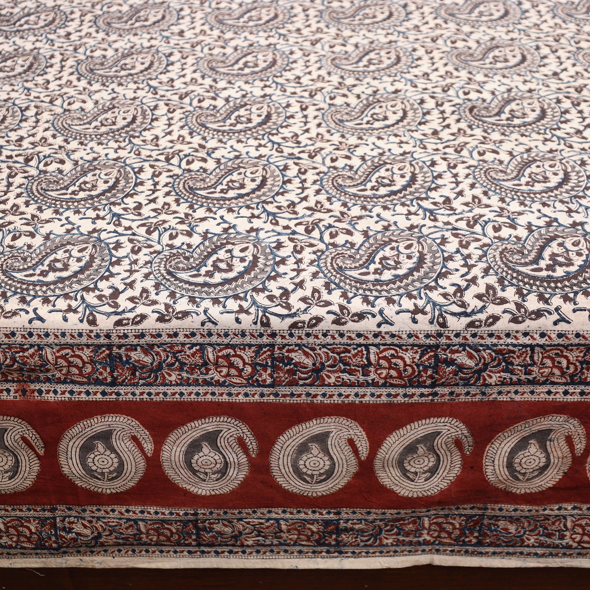 Fine quality grey kalamkari hand block printed natural dyedcotton double bed cover skillfully crafted by the artisans of Pedana. Showcasing an assortment of hand block printed motifs inspired by traditional kalamkari painting. Kalamkari is the earliest and more complex techniques of block-printing.