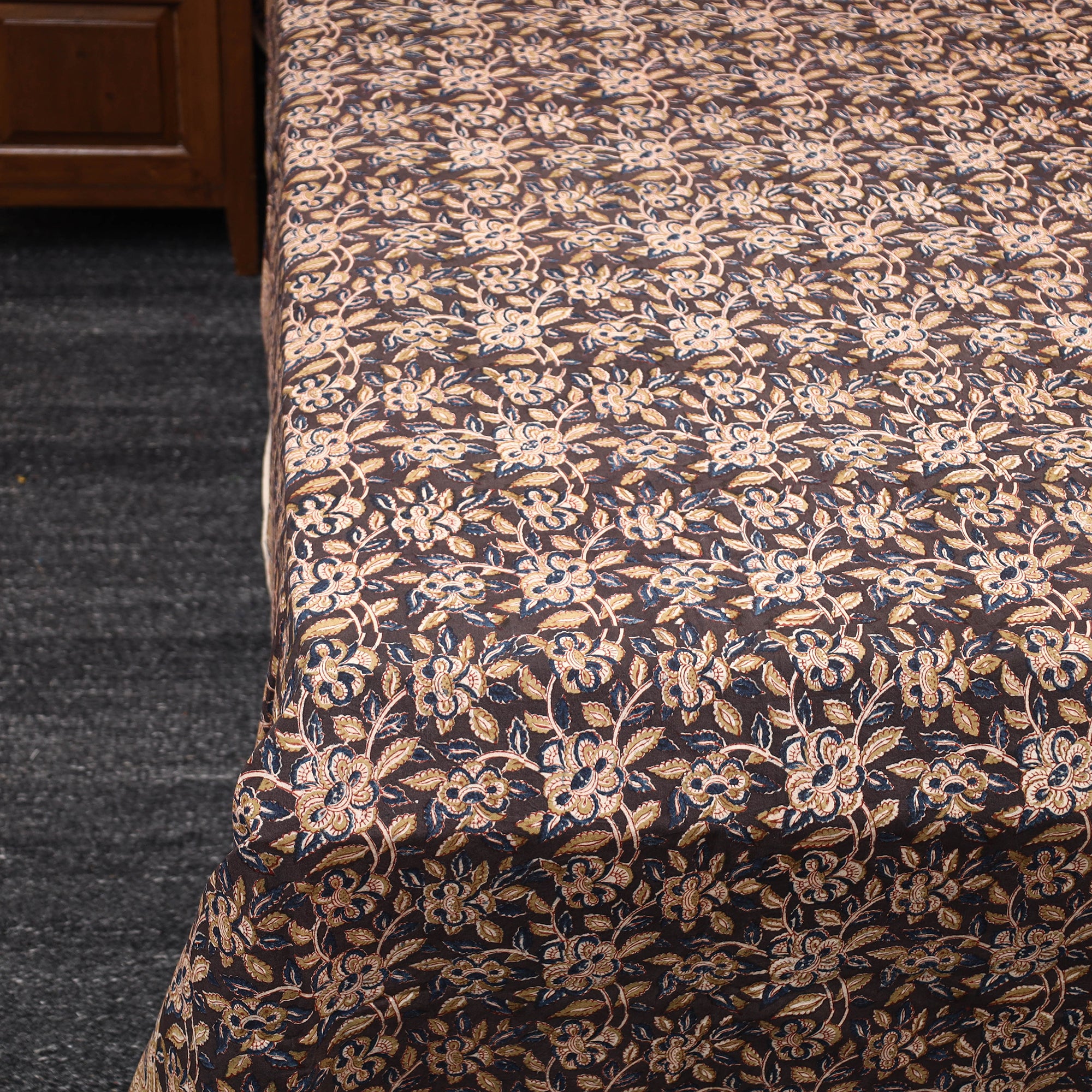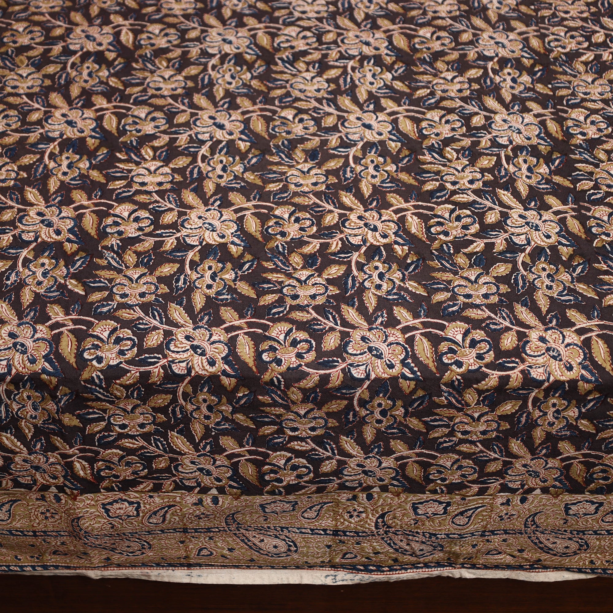 Fine quality brown kalamkari hand block printed natural dyed cotton double bed cover skillfully crafted by the artisans of Pedana. Showcasing an assortment of hand block printed motifs inspired by traditional kalamkari painting. Kalamkari is the earliest and more complex techniques of block-printing.