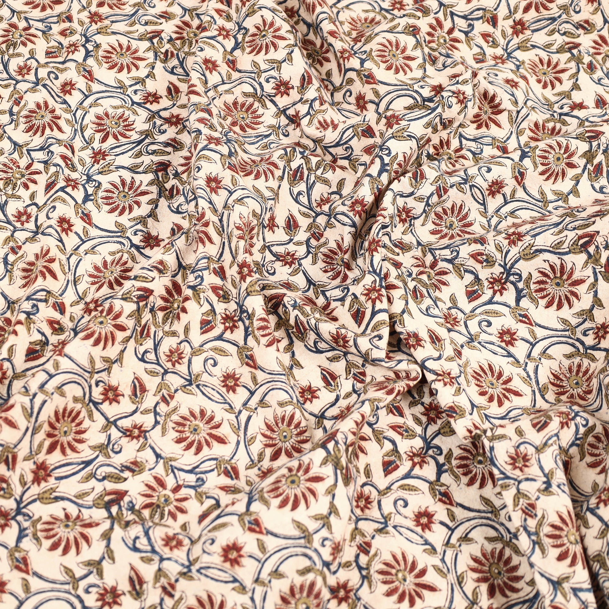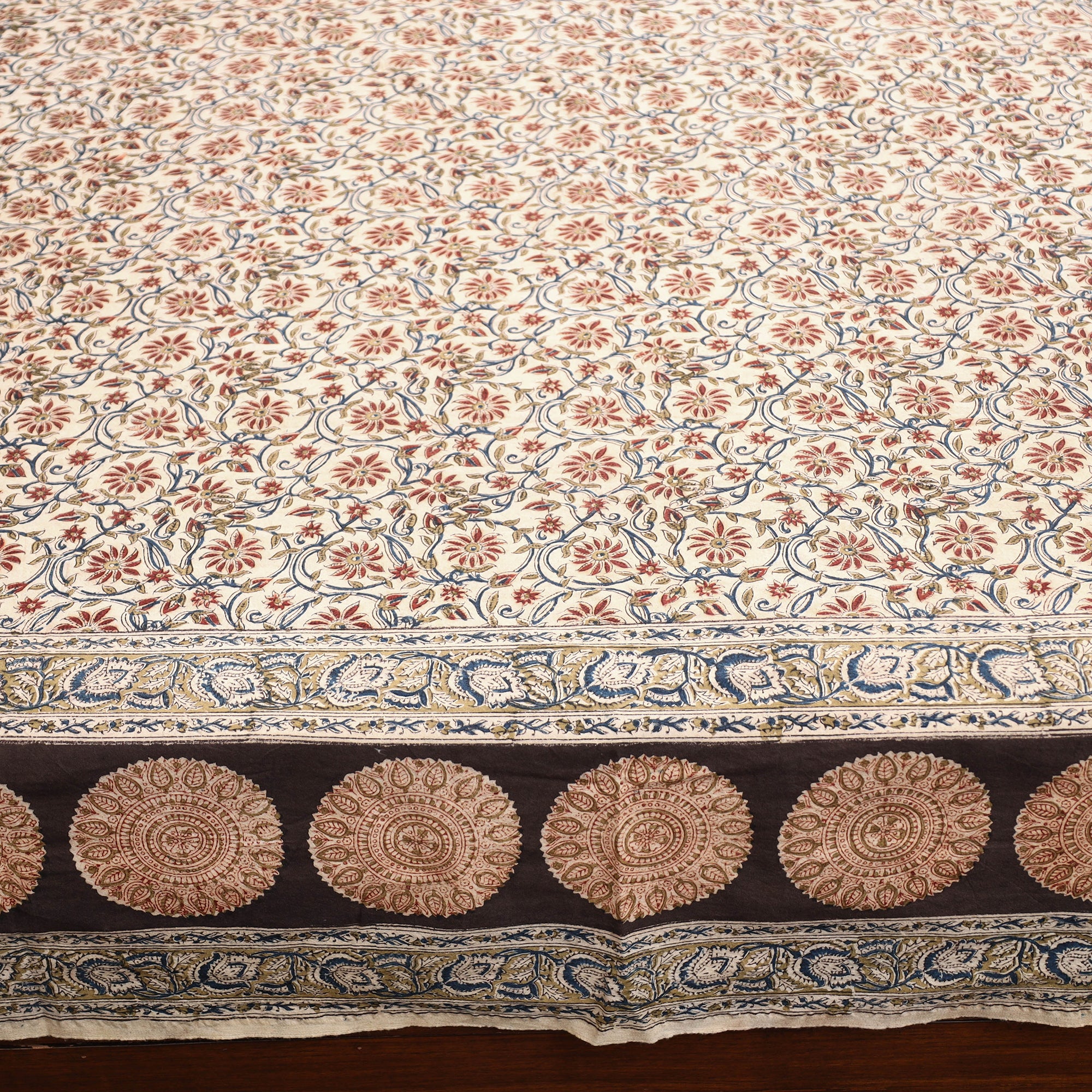 Fine quality beige kalamkari hand block printed natural dyedcotton double bed cover skillfully crafted by the artisans of Pedana. Showcasing an assortment of hand block printed motifs inspired by traditional kalamkari painting. Kalamkari is the earliest and more complex techniques of block-printing.
