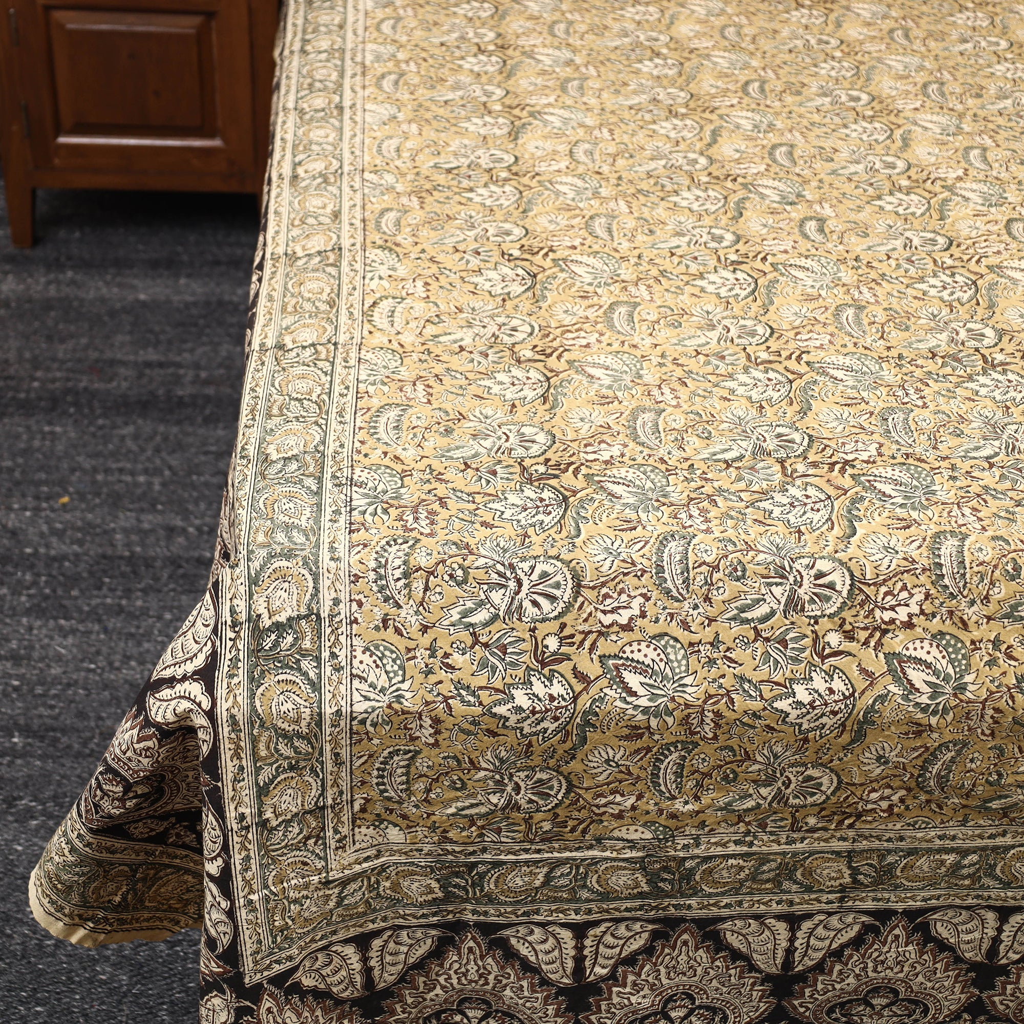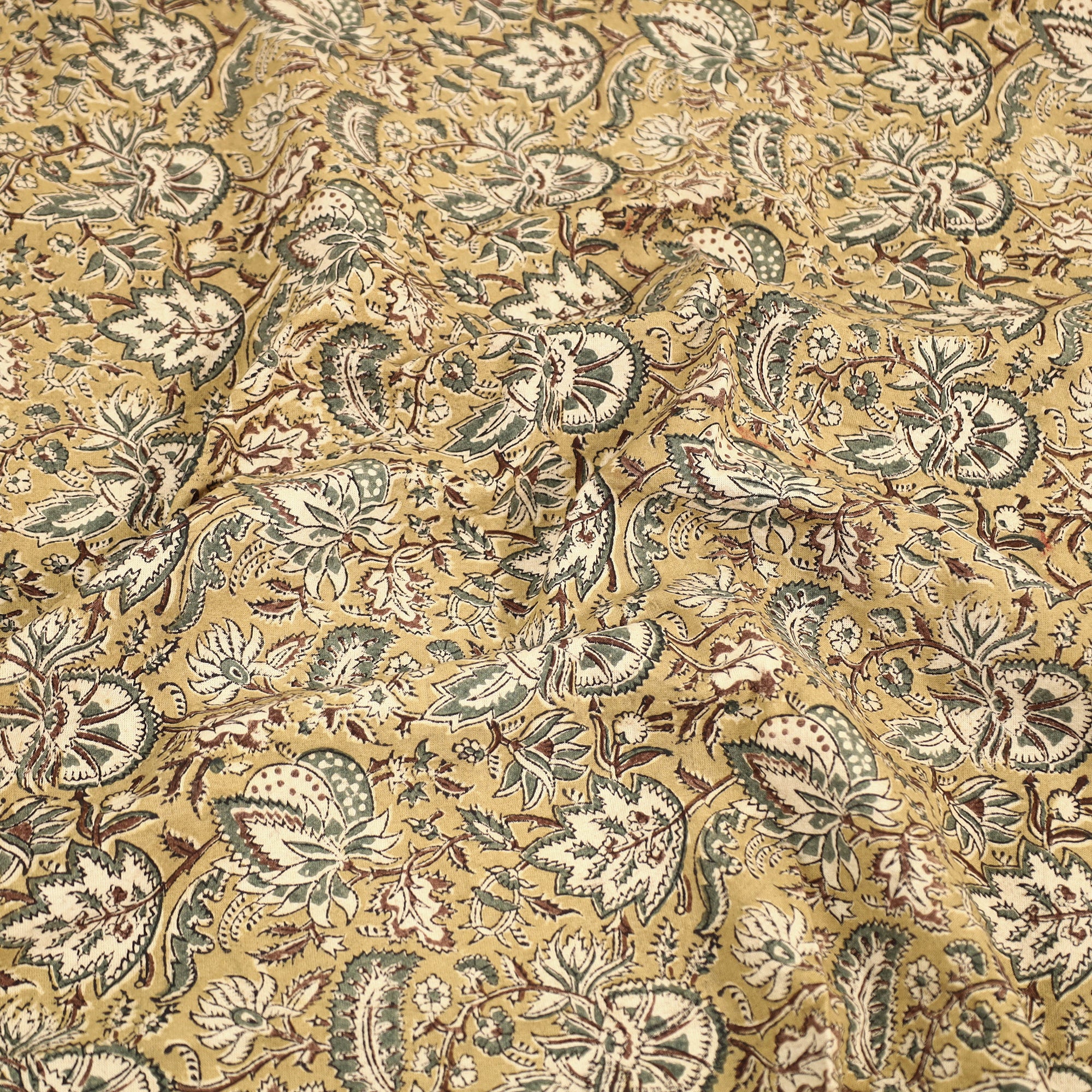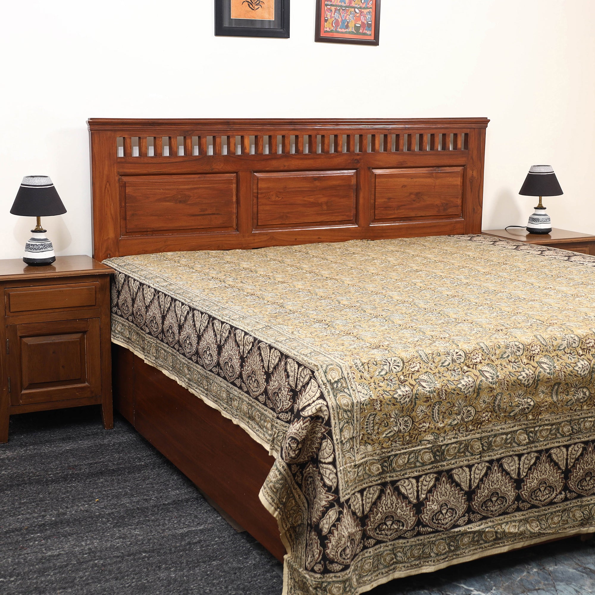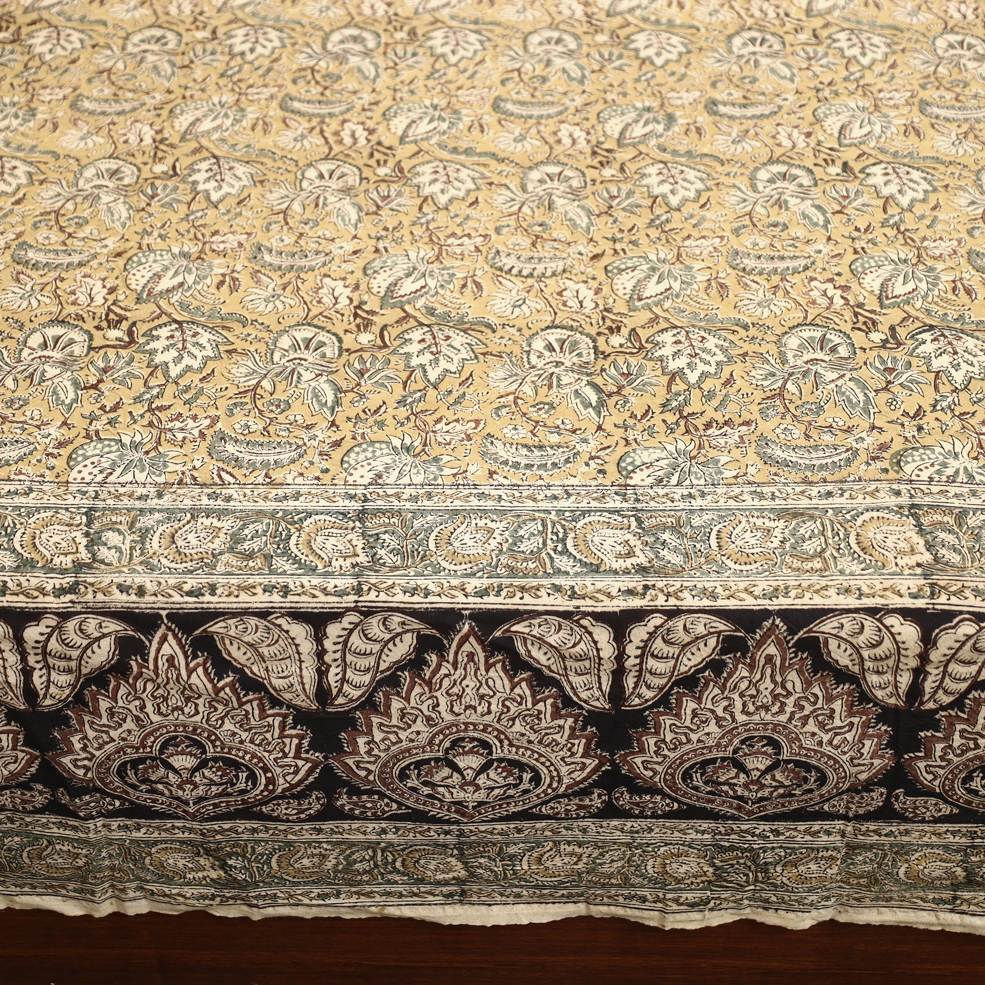 Fine quality yellow kalamkari hand block printed natural dyedcotton double bed cover skillfully crafted by the artisans of Pedana. Showcasing an assortment of hand block printed motifs inspired by traditional kalamkari painting. Kalamkari is the earliest and more complex techniques of block-printing.