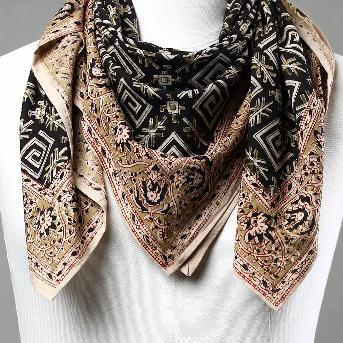 Elevate your style with this original black kalamkari block printed natural dyed cotton scarf skillfully crafted by the artisans of Pedana. The scarf features an assortment of hand block printed motifs inspired by traditional kalamkari painting. This scarf is perfect to add a touch of elegance to any outfit.