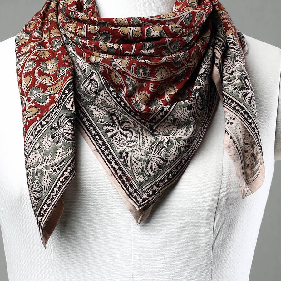 Elevate your style with this original red kalamkari block printed natural dyed cotton scarf skillfully crafted by the artisans of Pedana. The scarf features an assortment of hand block printed motifs inspired by traditional kalamkari painting. This scarf is perfect to add a touch of elegance to any outfit.