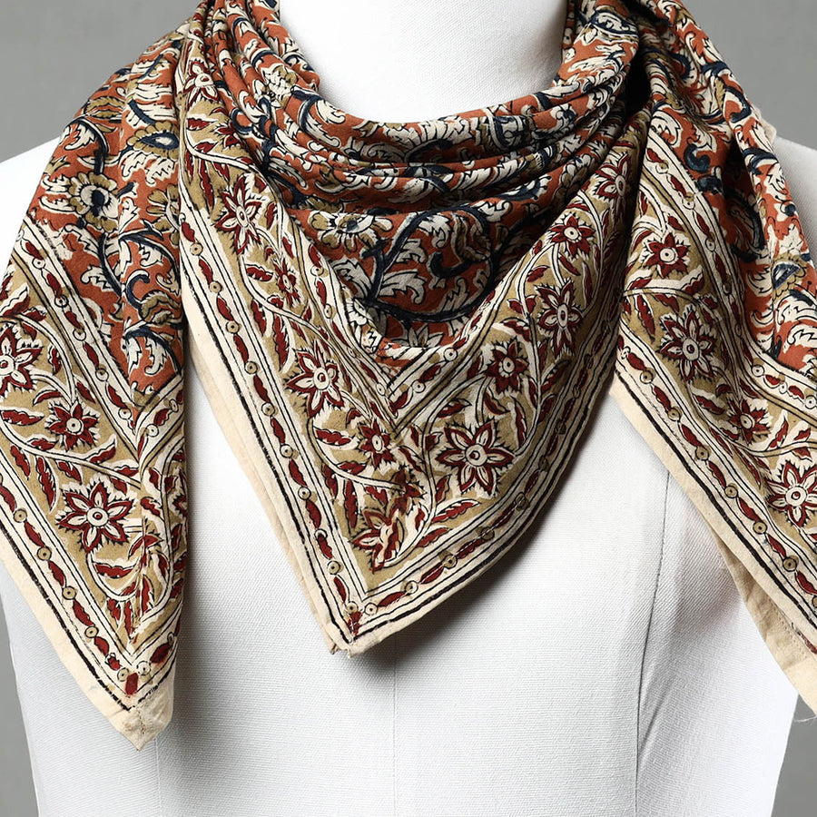 Elevate your style with this original orange kalamkari block printed natural dyed cotton scarf skillfully crafted by the artisans of Pedana. The scarf features an assortment of hand block printed motifs inspired by traditional kalamkari painting. This scarf is perfect to add a touch of elegance to any outfit.