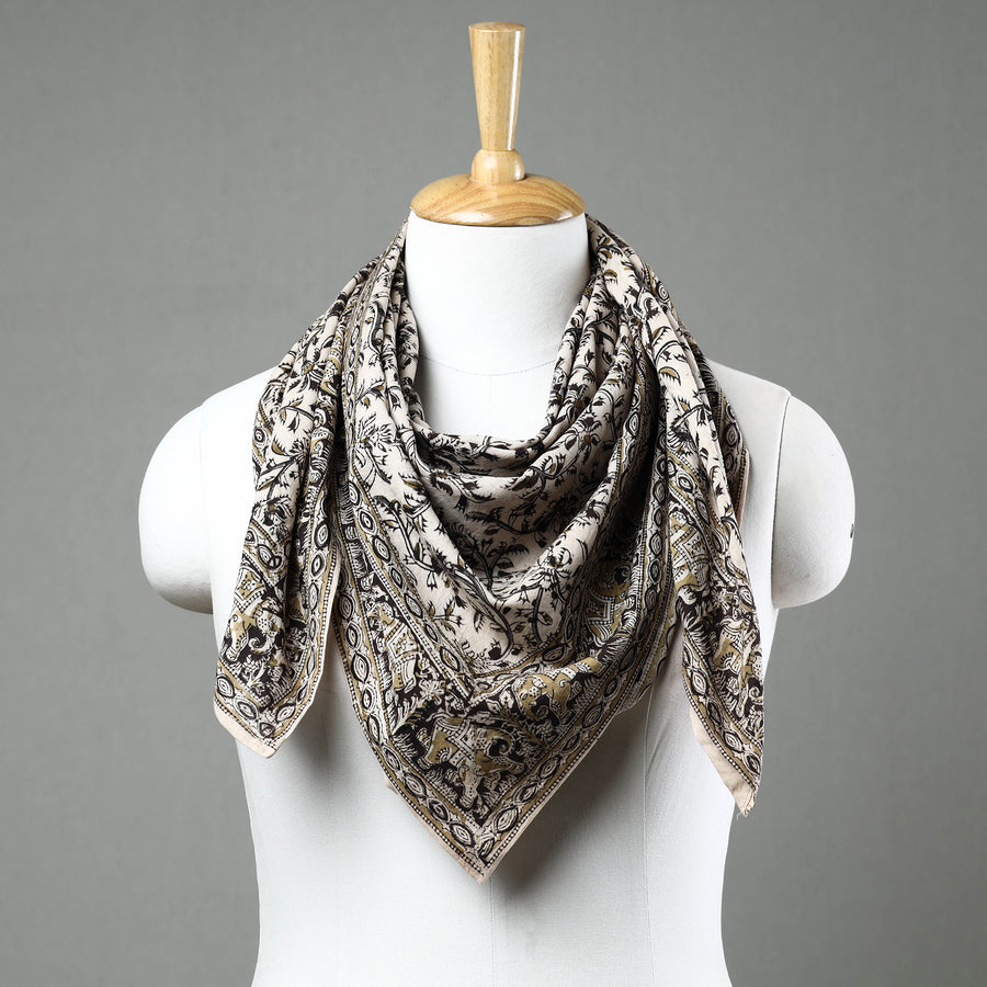 Elevate your style with this original beige kalamkari block printed natural dyed cotton scarf skillfully crafted by the artisans of Pedana. The scarf features an assortment of hand block printed motifs inspired by traditional kalamkari painting. This scarf is perfect to add a touch of elegance to any outfit.
