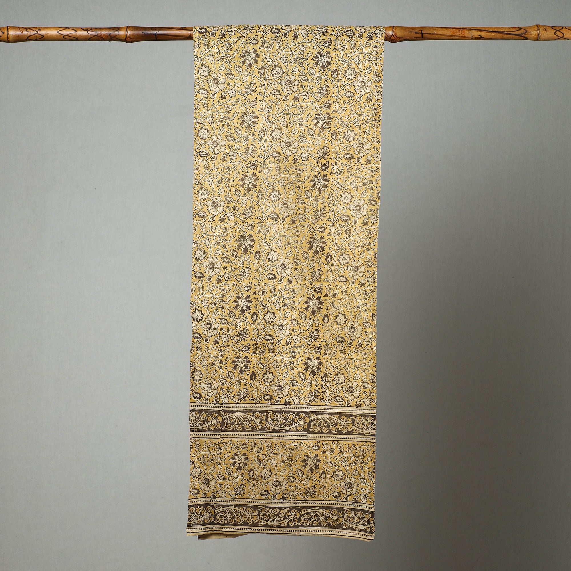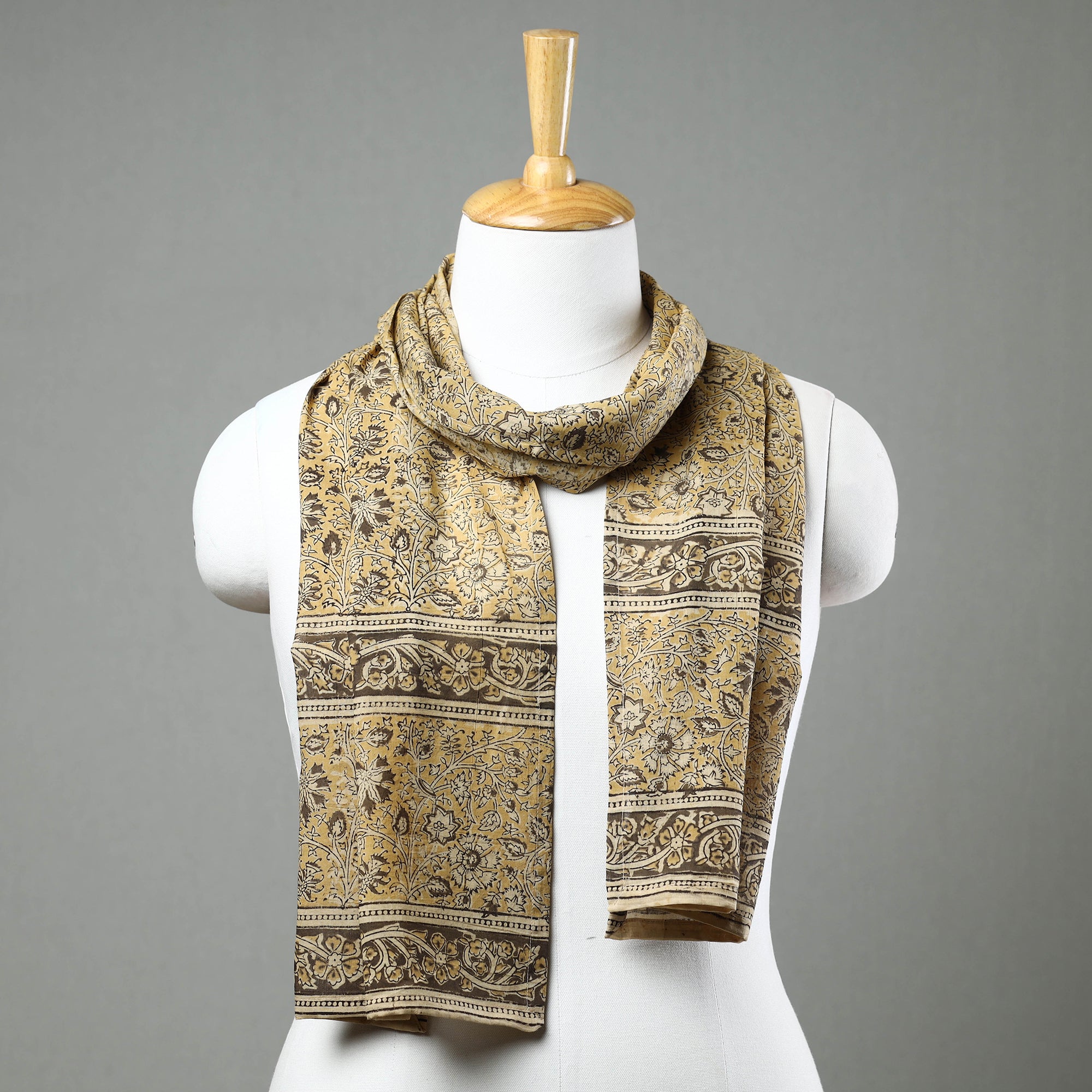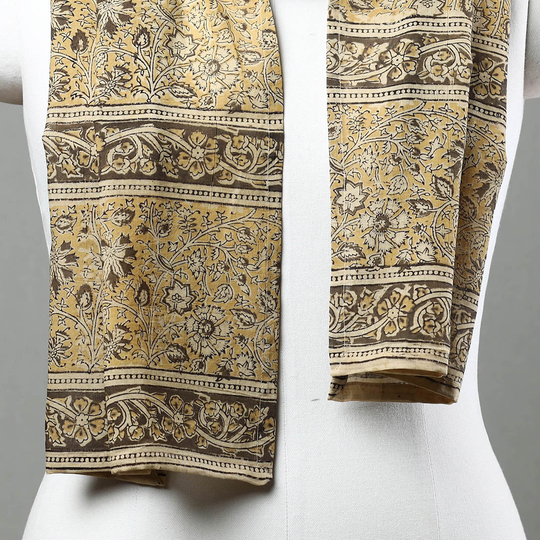 Elevate your style with this yellow original kalamkari block printed natural dyed cotton stole skillfully crafted by the artisans of Pedana. The stole features an assortment of hand block printed motifs inspired by traditional kalamkari painting. This stole is perfect to add a touch of elegance to any outfit.