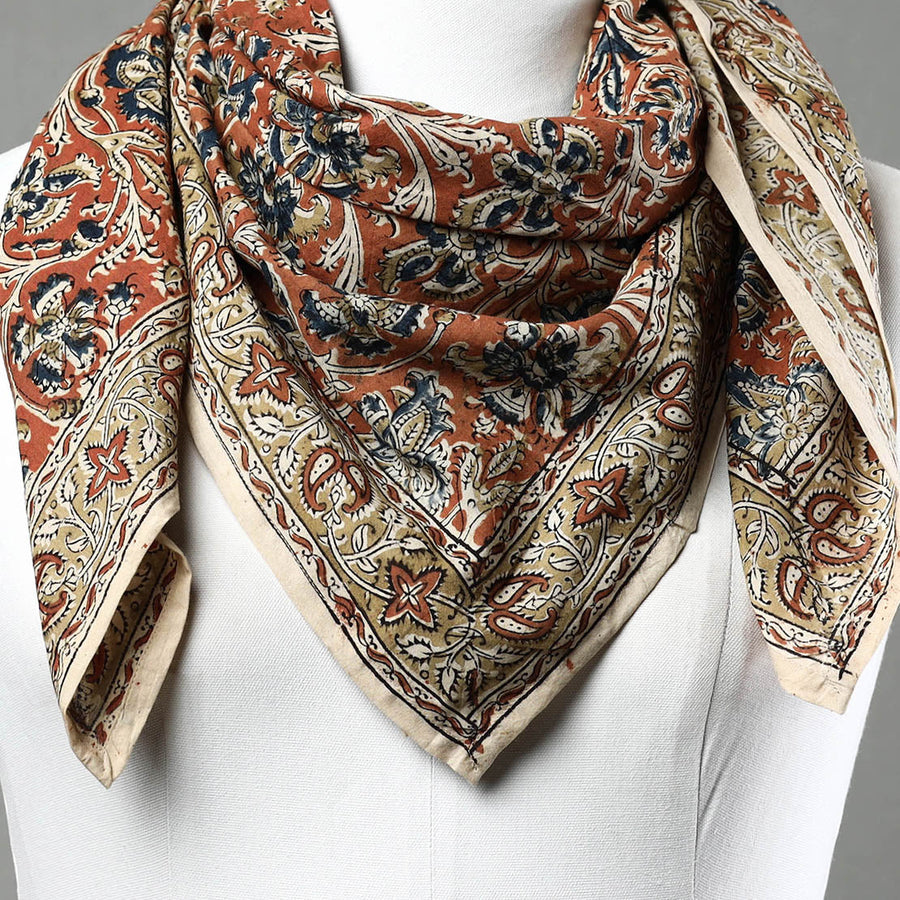 Elevate your style with this original orange kalamkari block printed natural dyed cotton scarf skillfully crafted by the artisans of Pedana. The scarf features an assortment of hand block printed motifs inspired by traditional kalamkari painting. This scarf is perfect to add a touch of elegance to any outfit.