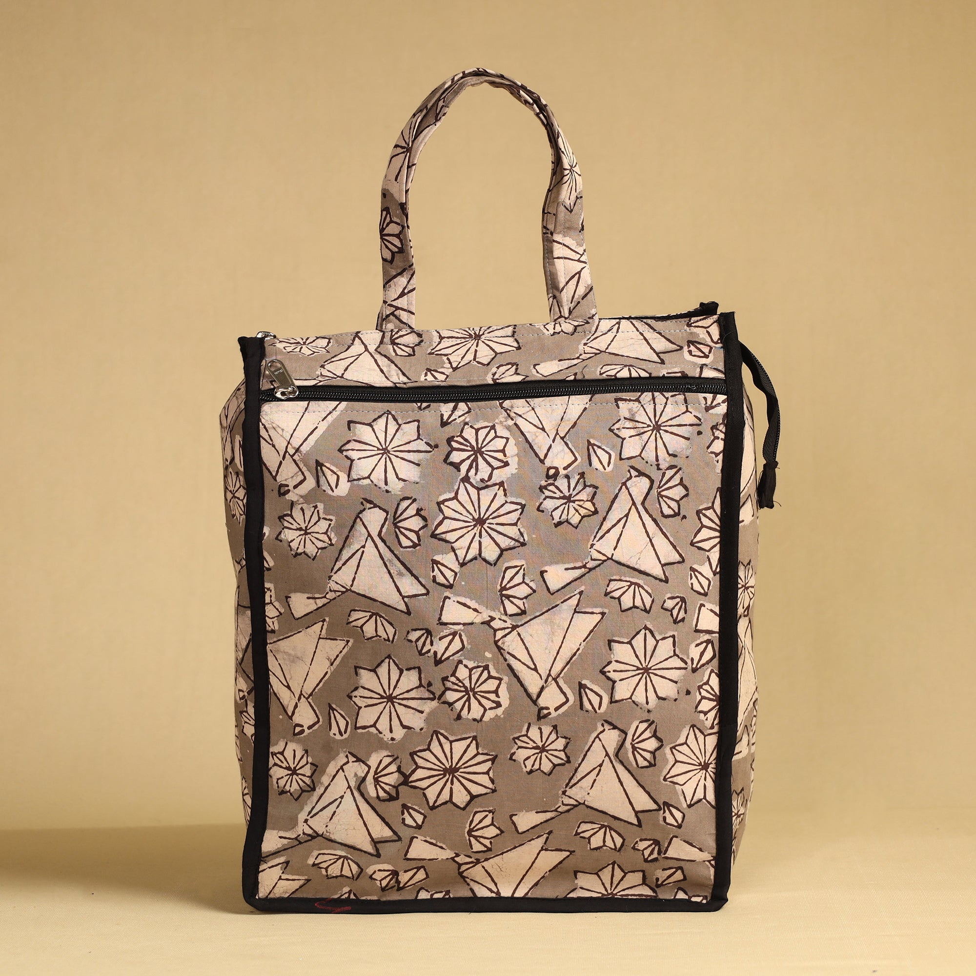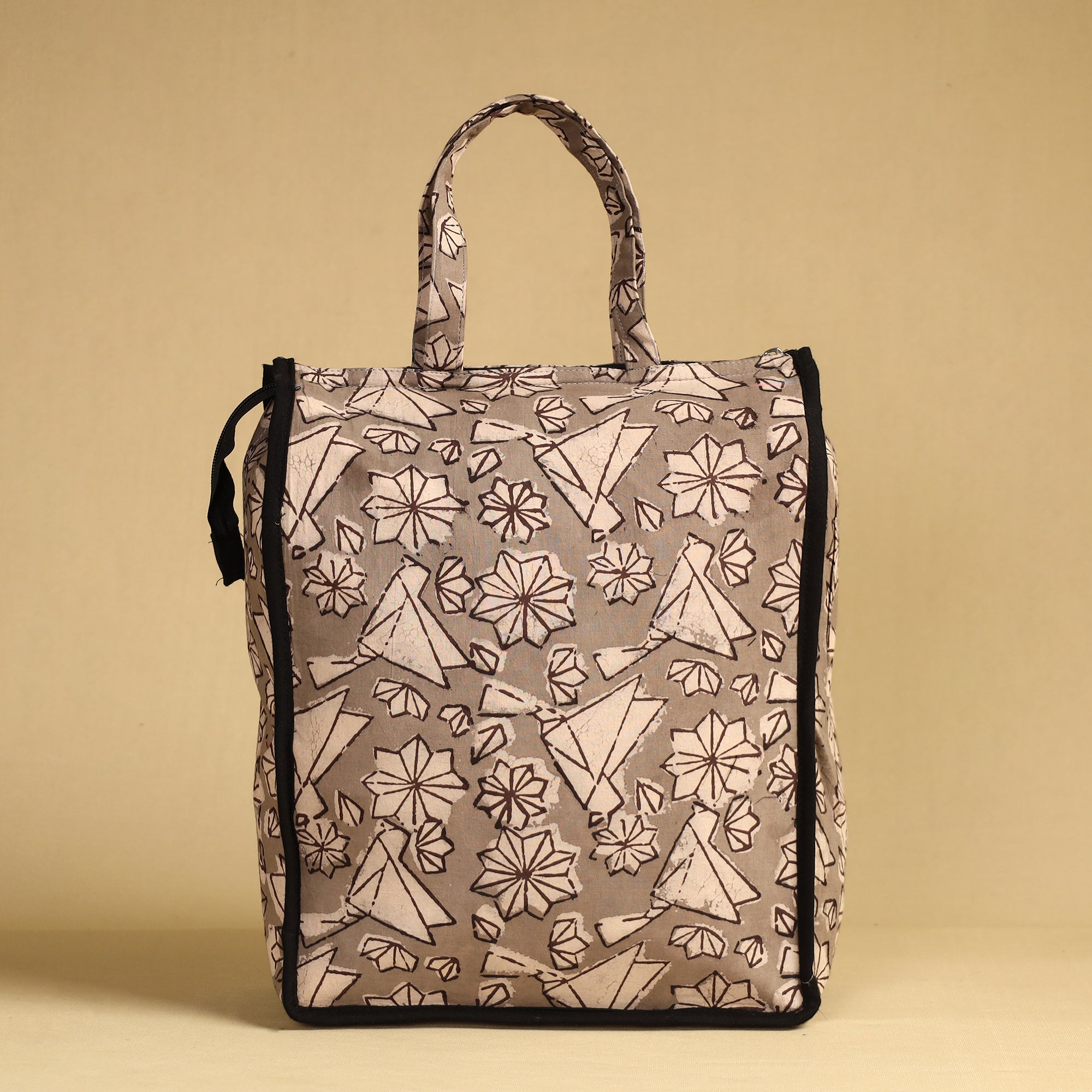 Enhance your shopping routine with our grey handcrafted cotton shopping bag. This shopping bag is made from cotton fabrics. Textured with handmade textiles from India, it is a convenient, stylish, and sustainable companion for your daily shopping, and it has enough space to accommodate most of the items.