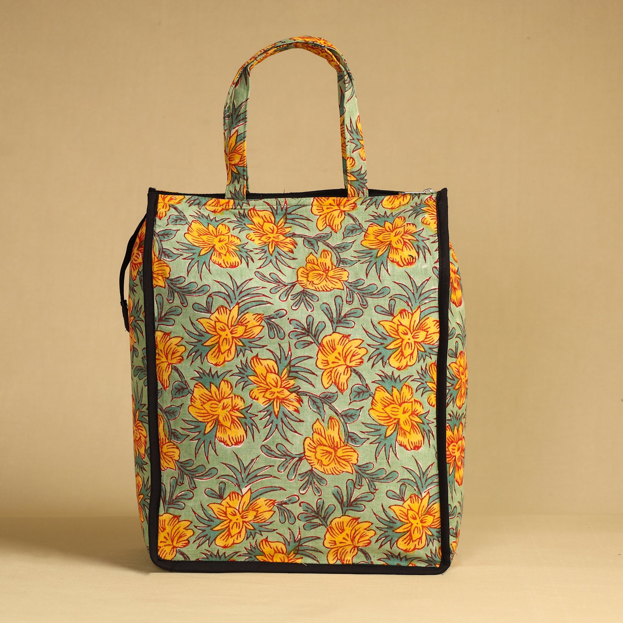 Enhance your shopping routine with our green handcrafted cotton shopping bag. This shopping bag is made from cotton fabrics. Textured with handmade textiles from India, it is a convenient, stylish, and sustainable companion for your daily shopping, and it has enough space to accommodate most of the items.