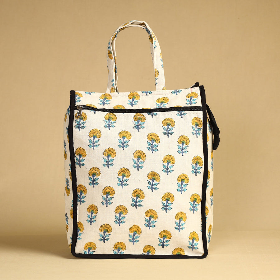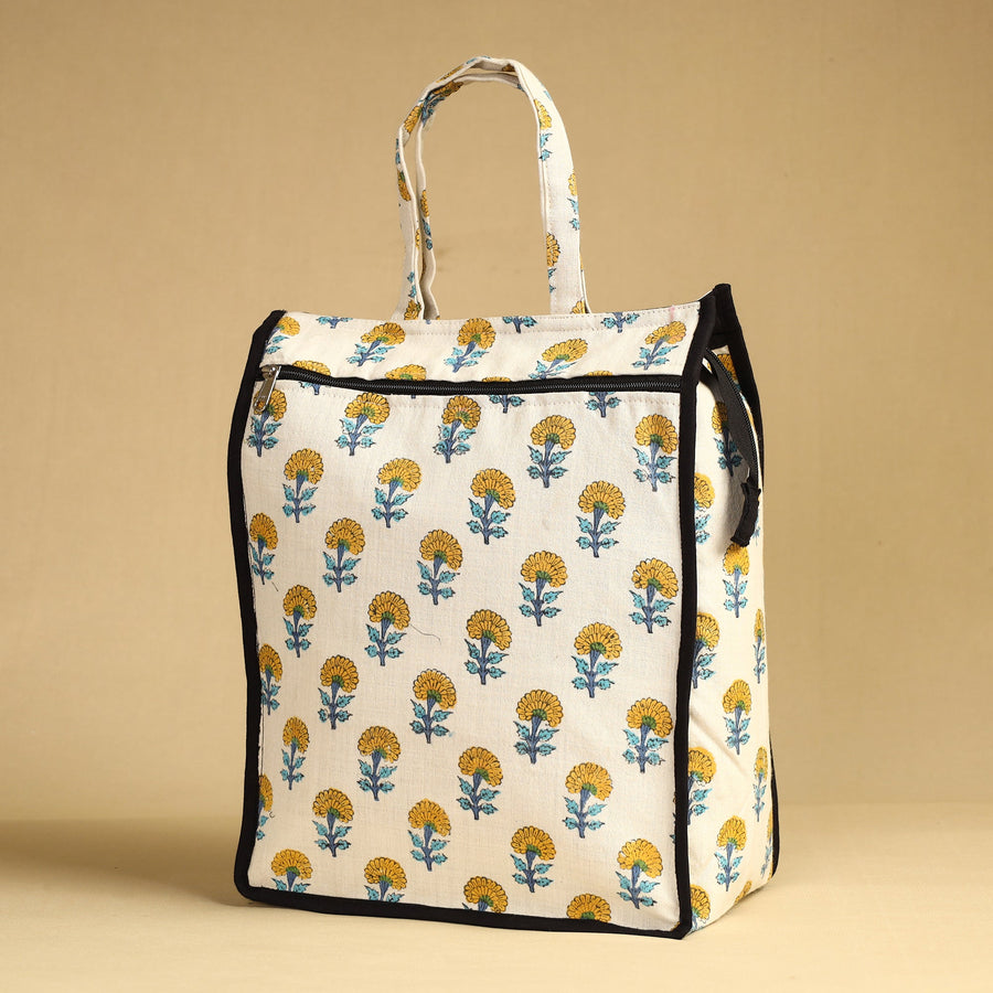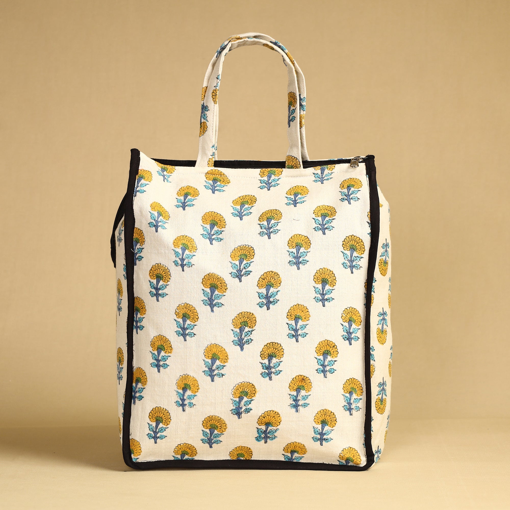 Enhance your shopping routine with our white handcrafted cotton shopping bag. This shopping bag is made from cotton fabrics. Textured with handmade textiles from India, it is a convenient, stylish, and sustainable companion for your daily shopping, and it has enough space to accommodate most of the items.