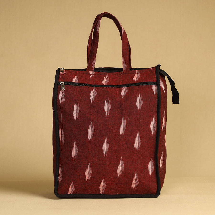 Enhance your shopping routine with our maroon handcrafted cotton shopping bag. This shopping bag is made from cotton fabrics. Textured with handmade textiles from India, it is a convenient, stylish, and sustainable companion for your daily shopping, and it has enough space to accommodate most of the items.