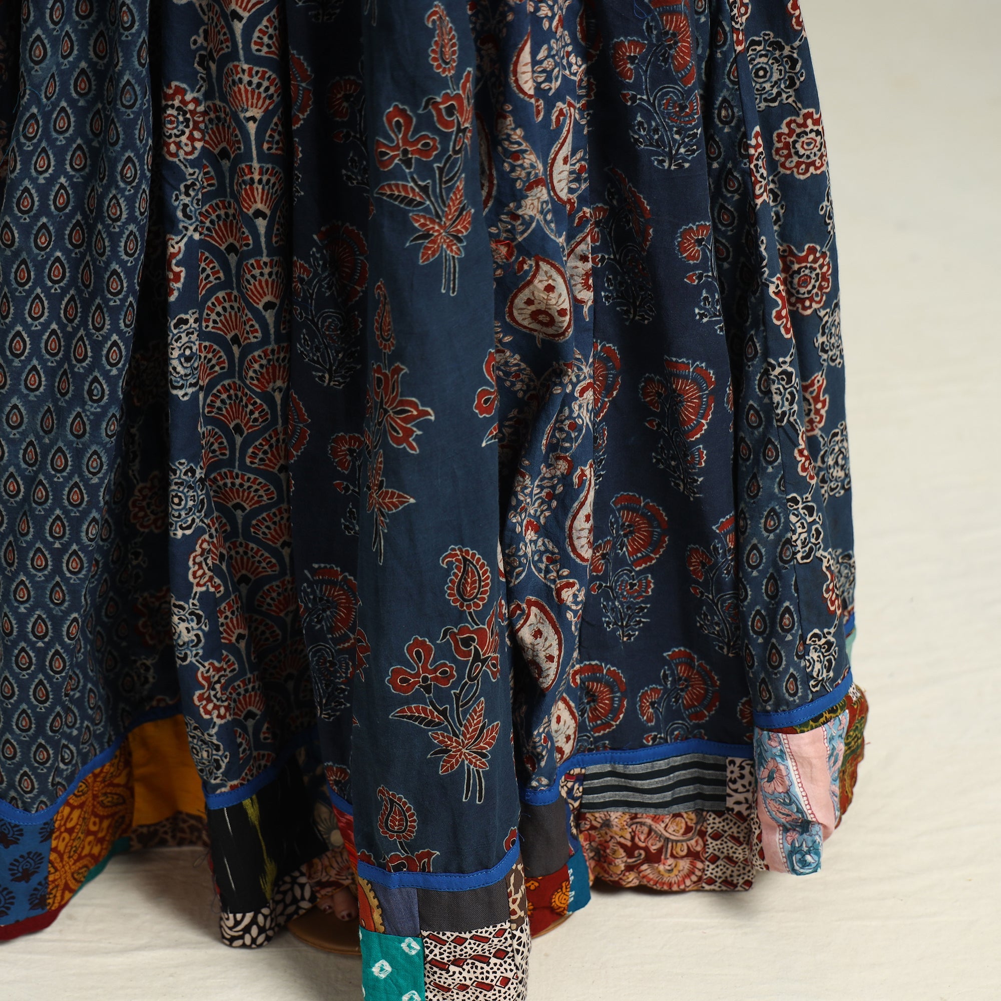 Elevate your wardrobe with our blue patchwork long skirt, skillfully crafted from ajrakh block-printed, natural-dyed cotton fabric. This skirt boasts a waist tie-up closure, allowing for a customized and comfortable fit. The intricate patterns and vibrant colors reflect the cultural heritage of Gujarat. Perfect for both casual and semi-formal occasions.