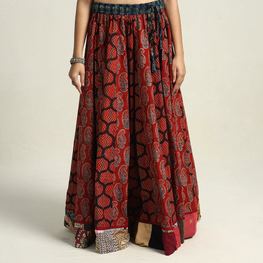 Elevate your wardrobe with our red patchwork long skirt, skillfully crafted from ajrakh block-printed, natural-dyed cotton fabric. This skirt boasts a waist tie-up closure, allowing for a customized and comfortable fit. The intricate patterns and vibrant colors reflect the cultural heritage of Gujarat. Perfect for both casual and semi-formal occasions.
