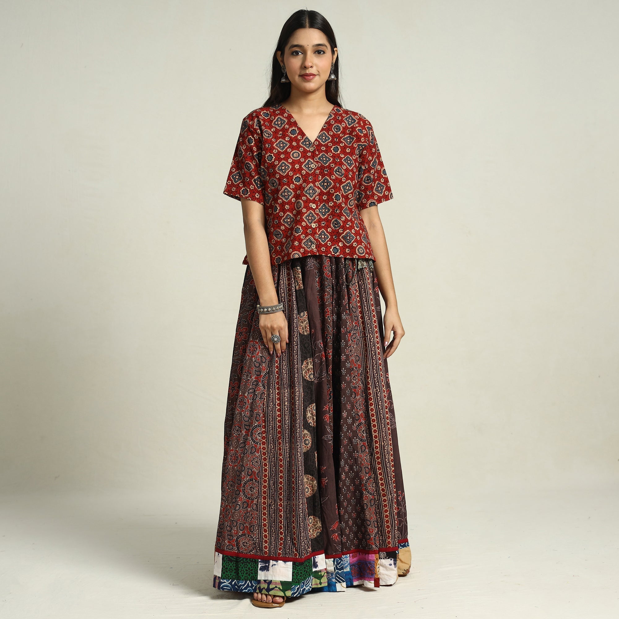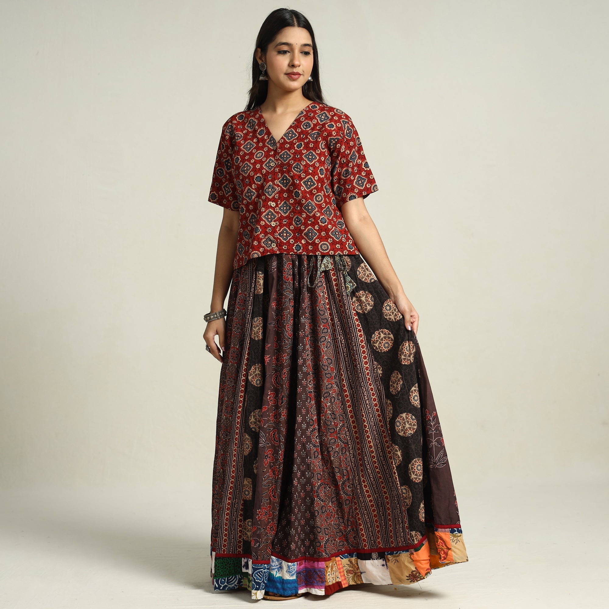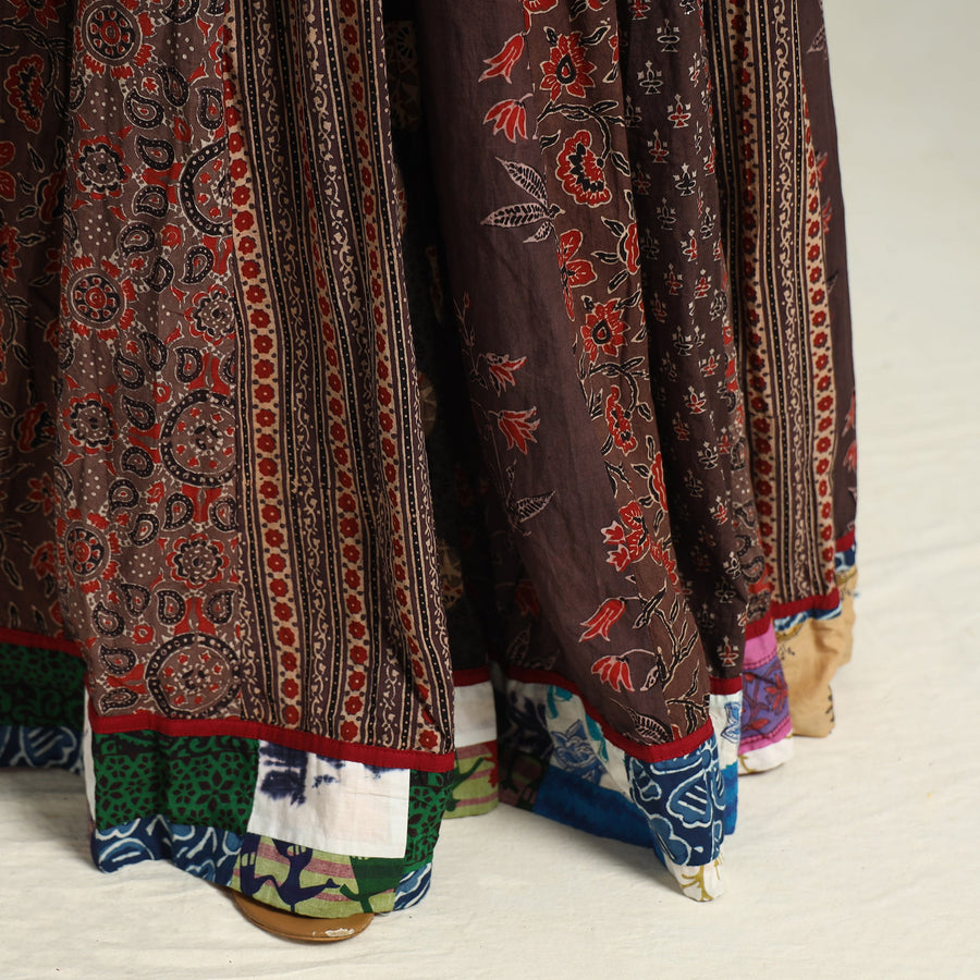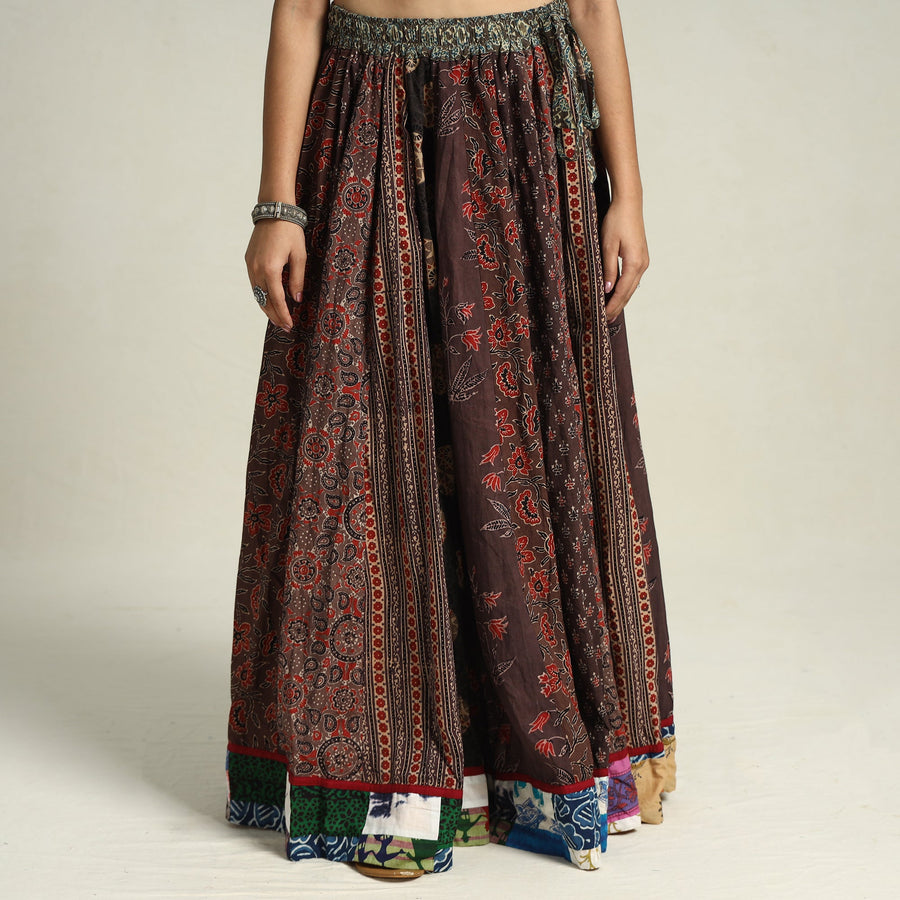 Elevate your wardrobe with our brown patchwork long skirt, skillfully crafted from ajrakh block-printed, natural-dyed cotton fabric. This skirt boasts a waist tie-up closure, allowing for a customized and comfortable fit. The intricate patterns and vibrant colors reflect the cultural heritage of Gujarat. Perfect for both casual and semi-formal occasions.