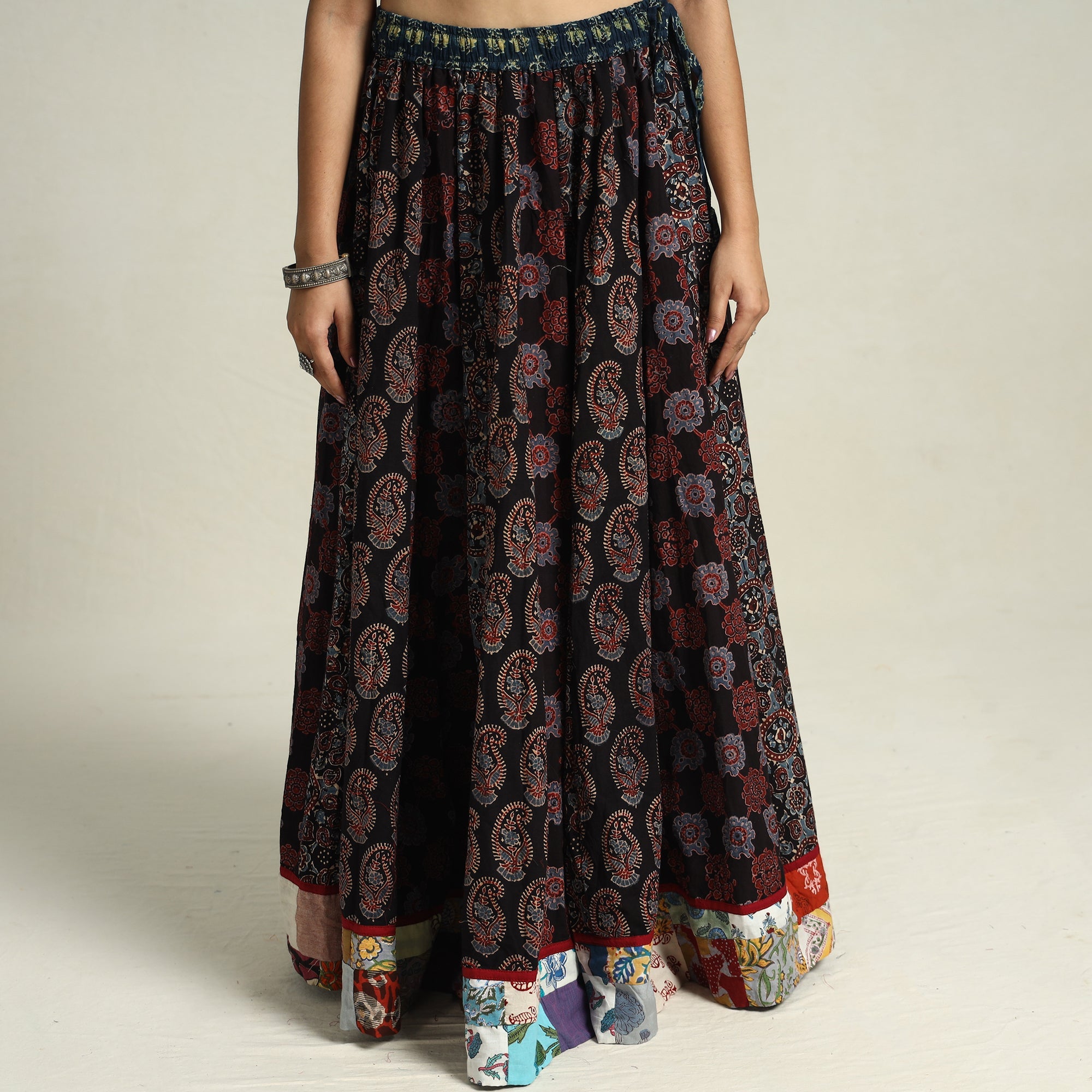 Elevate your wardrobe with our black patchwork long skirt, skillfully crafted from ajrakh block-printed, natural-dyed cotton fabric. This skirt boasts a waist tie-up closure, allowing for a customized and comfortable fit. The intricate patterns and vibrant colors reflect the cultural heritage of Gujarat. Perfect for both casual and semi-formal occasions.