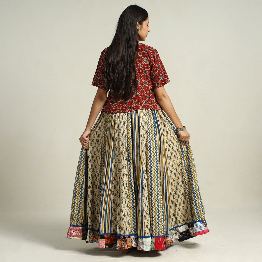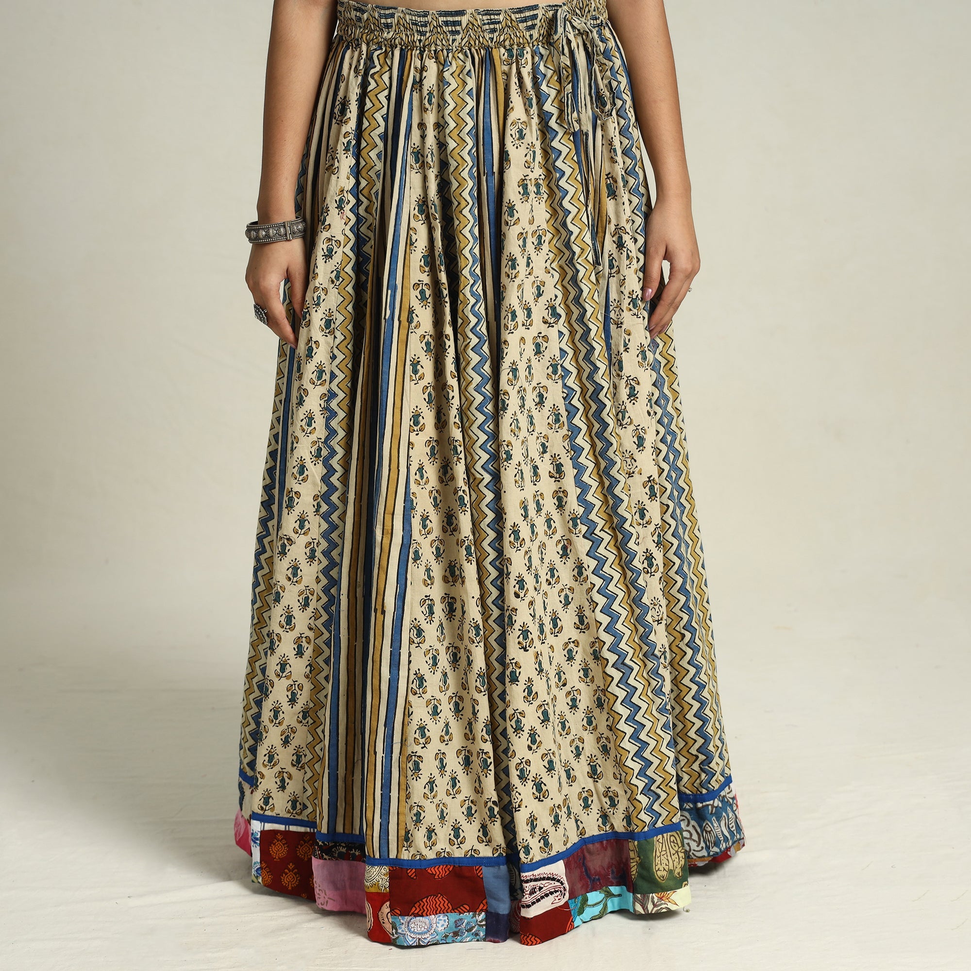 Elevate your wardrobe with our beige patchwork long skirt, skillfully crafted from ajrakh block-printed, natural-dyed cotton fabric. This skirt boasts a waist tie-up closure, allowing for a customized and comfortable fit. The intricate patterns and vibrant colors reflect the cultural heritage of Gujarat. Perfect for both casual and semi-formal occasions.
