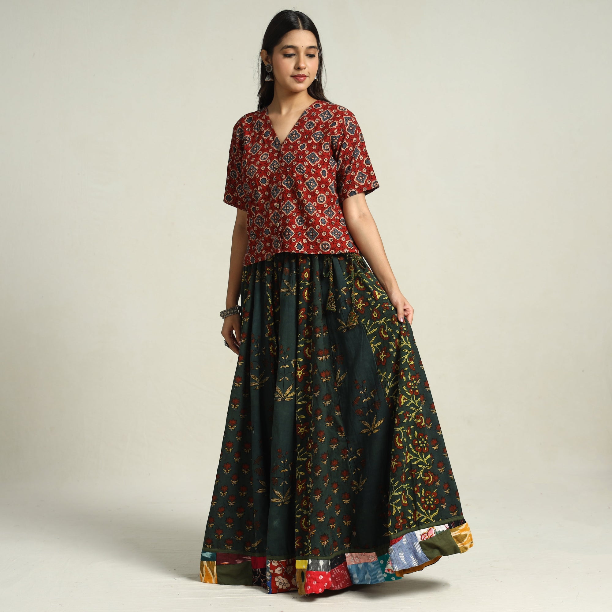 Elevate your wardrobe with our green patchwork long skirt, skillfully crafted from ajrakh block-printed, natural-dyed cotton fabric. This skirt boasts a waist tie-up closure, allowing for a customized and comfortable fit. The intricate patterns and vibrant colors reflect the cultural heritage of Gujarat. Perfect for both casual and semi-formal occasions.