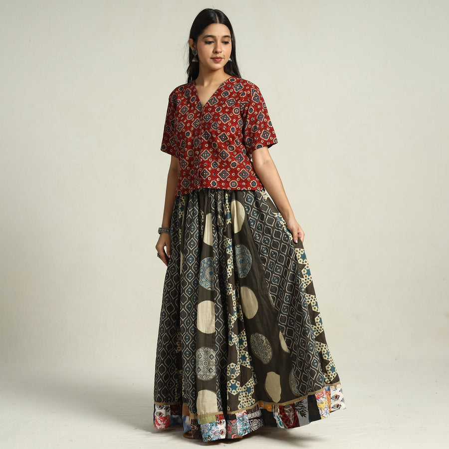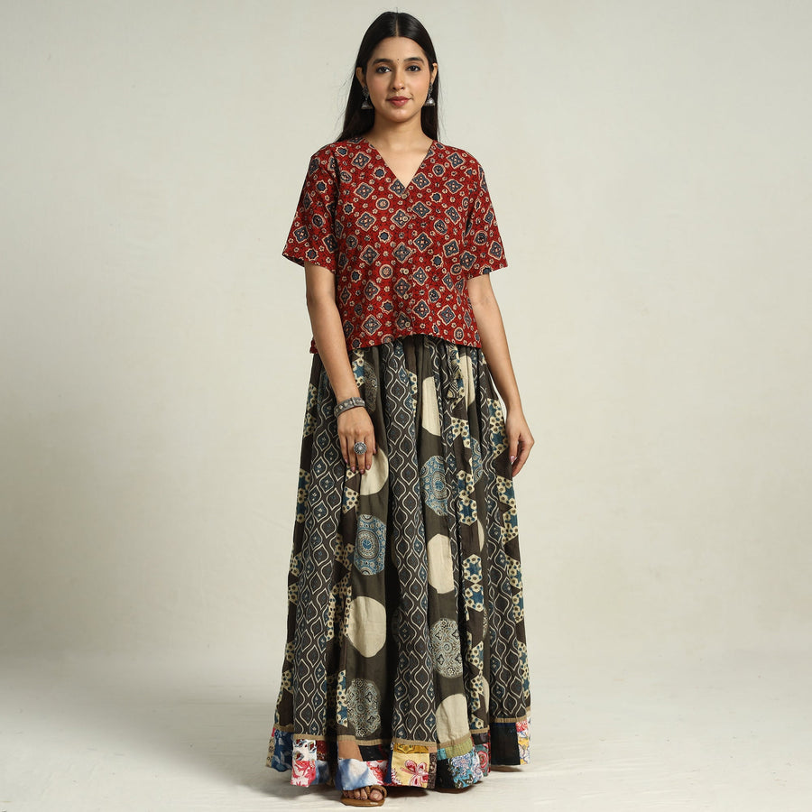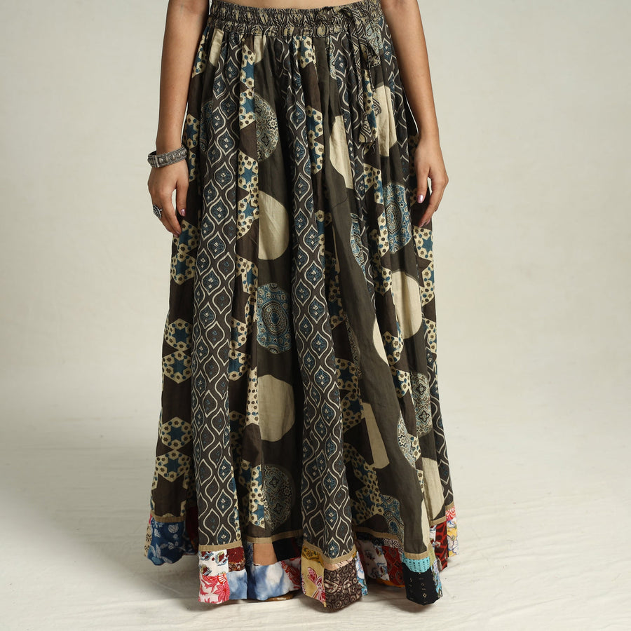Elevate your wardrobe with our brown patchwork long skirt, skillfully crafted from ajrakh block-printed, natural-dyed cotton fabric. This skirt boasts a waist tie-up closure, allowing for a customized and comfortable fit. The intricate patterns and vibrant colors reflect the cultural heritage of Gujarat. Perfect for both casual and semi-formal occasions.