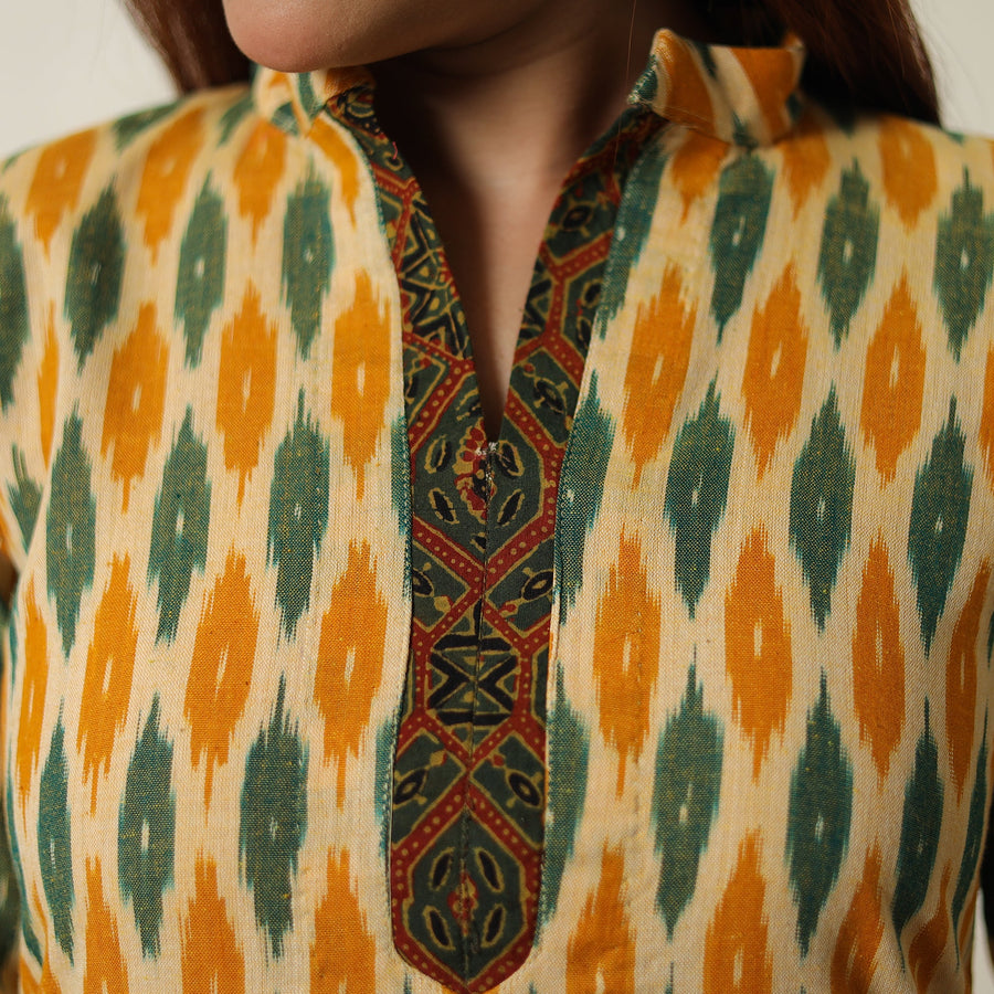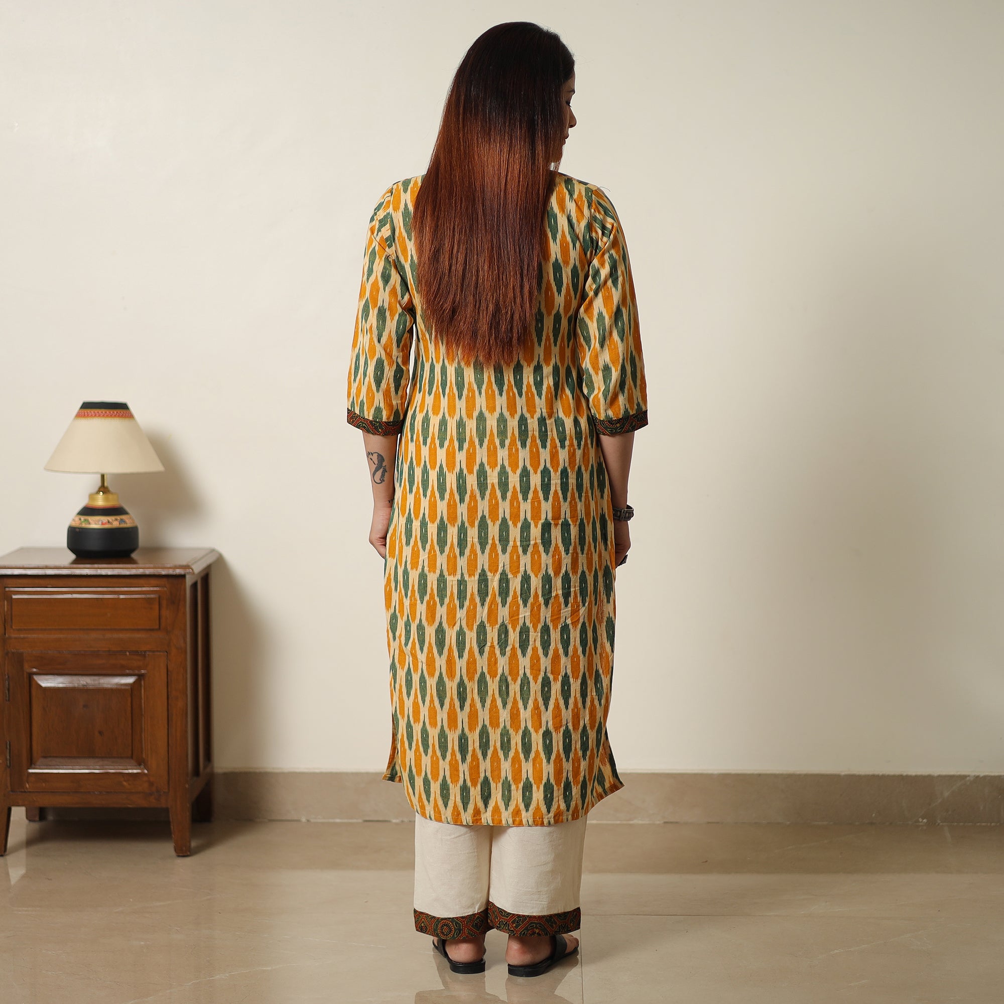 This pochampally ikat weave cotton kurta with palazzo and dupatta set is the perfect blend of comfort and style. This suit set is made of handloom cotton fabric, ensuring a comfortable feel against your skin. The kurta also features a ajrakh lace design and a convenient one-side pocket, perfect for carrying small essentials, and the palazzo features an elasticized waist and two side pockets, adding functionality to this palazzo.