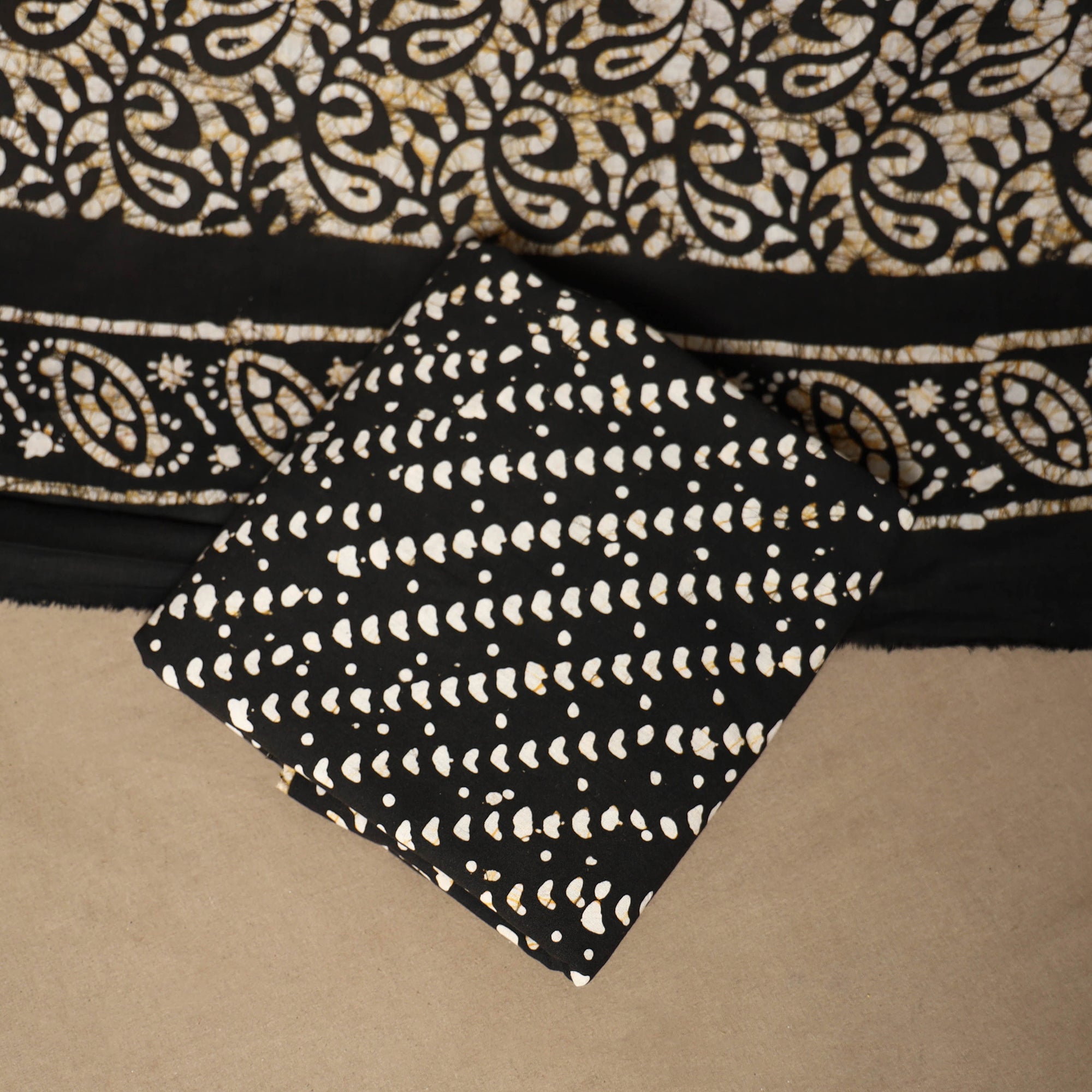 This black 3pc cotton kutch batik print dress material, crafted in Kutch using traditional wax-resist dyeing techniques. Batik offers both durability and comfort, making it a perfect choice for everyday or festive wear. The vibrant colors and intricate designs make this set a statement piece.