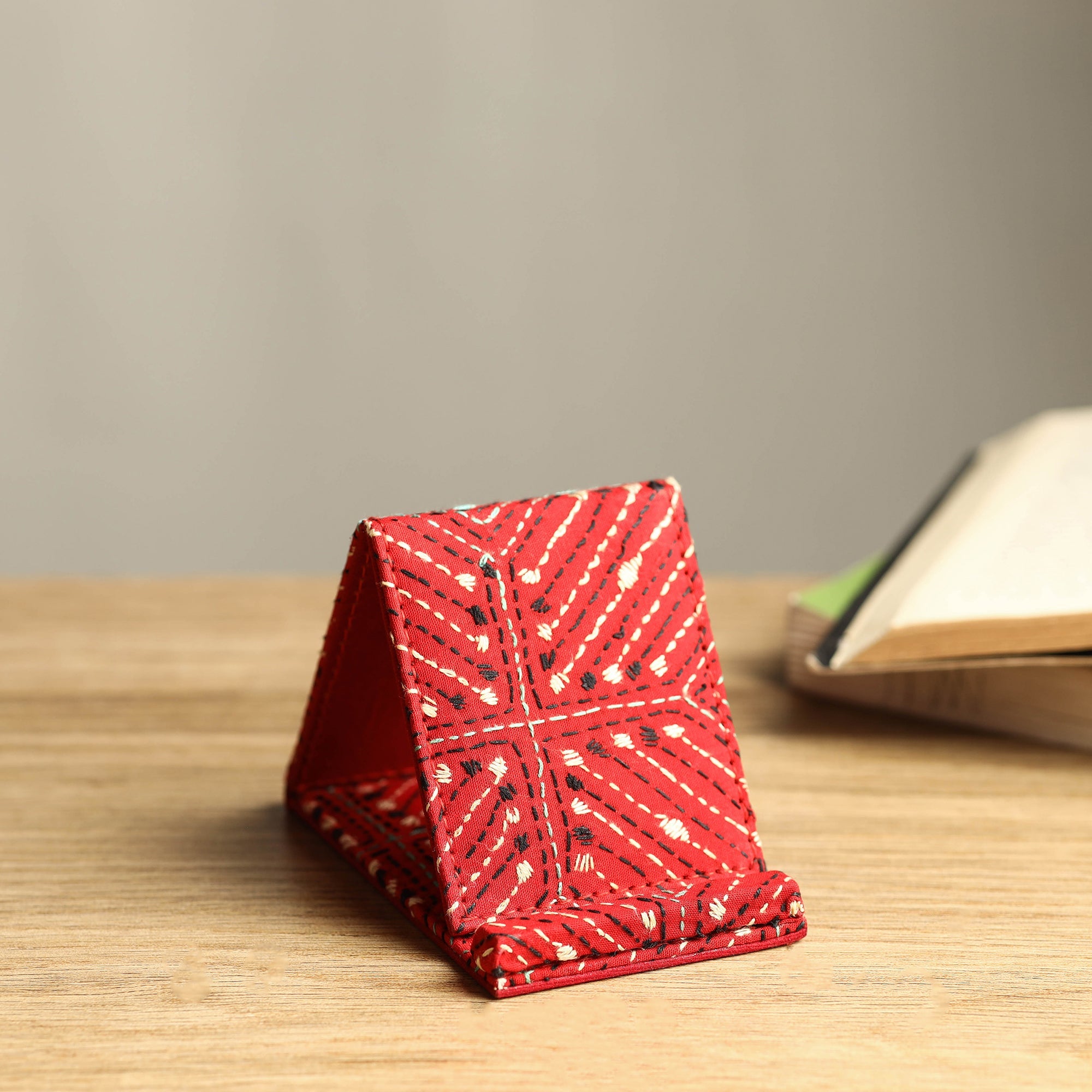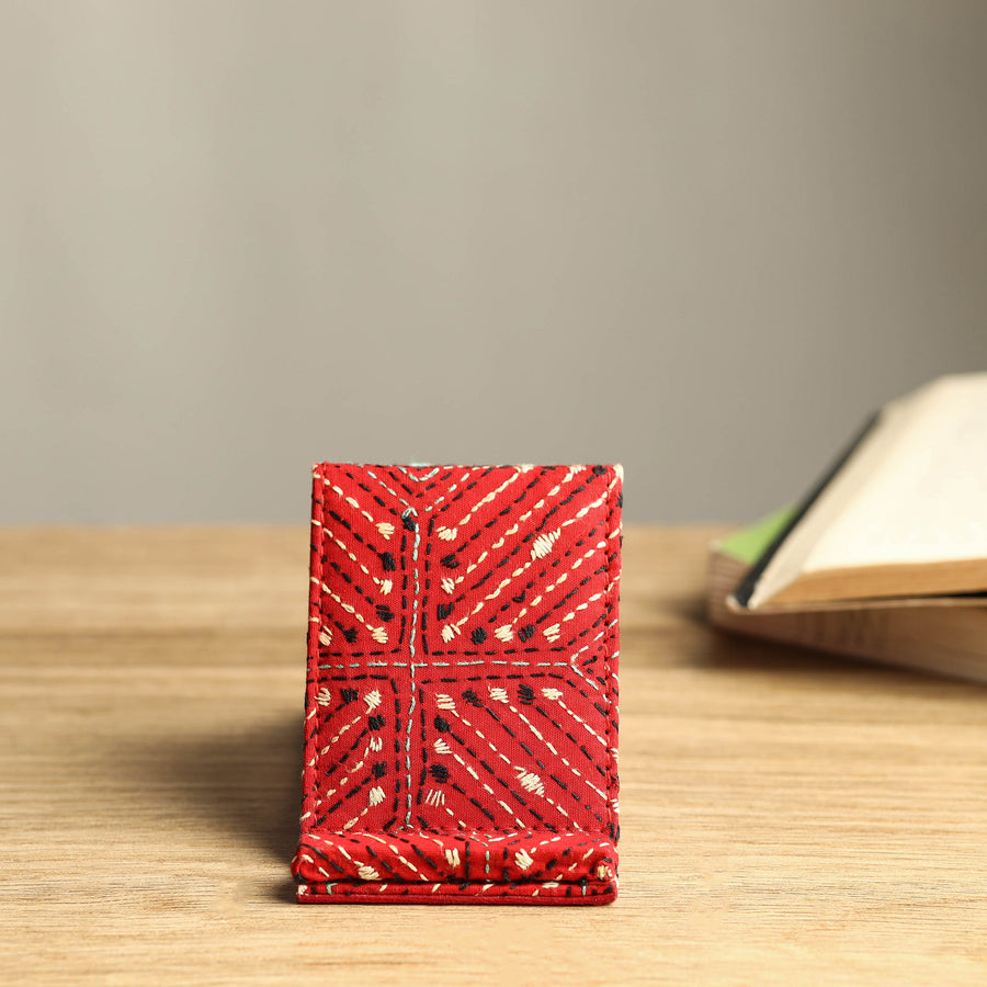 Handcrafted kantha-embroidered mobile stand made of hard board. Designed with contemporary patterns, it has been hand-embroidered using West Bengal's traditional craft technique of Kantha. You can take this mobile stand anywhere on any journey and use your mobile while giving rest to your hands.