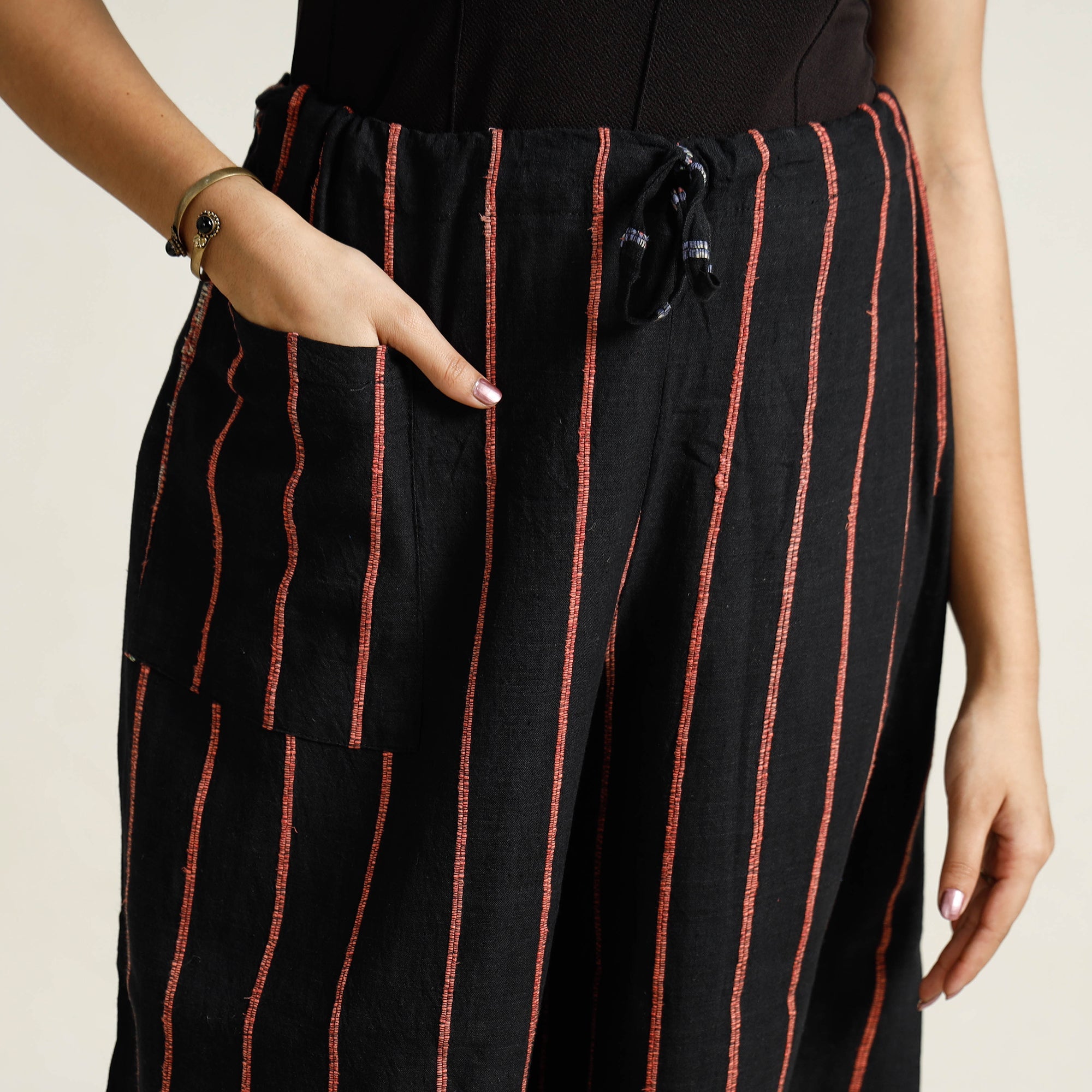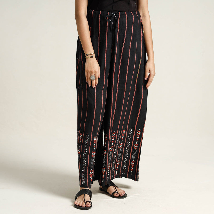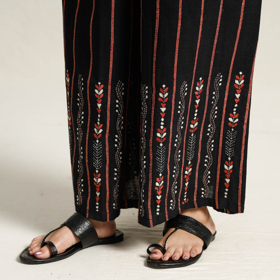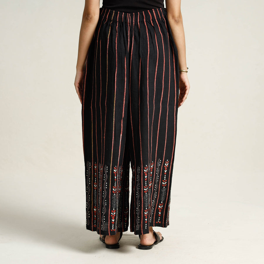 Elevate your style with this stunning black bengal khesh weaving kantha embroidery cotton palazzo from West Bengal. Made from cotton, this palazzo is designed with khesh weaving and hand embroidered using West Bengal's traditional craft technique of Kantha. Khesh weaving has new thread in the warp and thin strips of sarees are used in the weft.