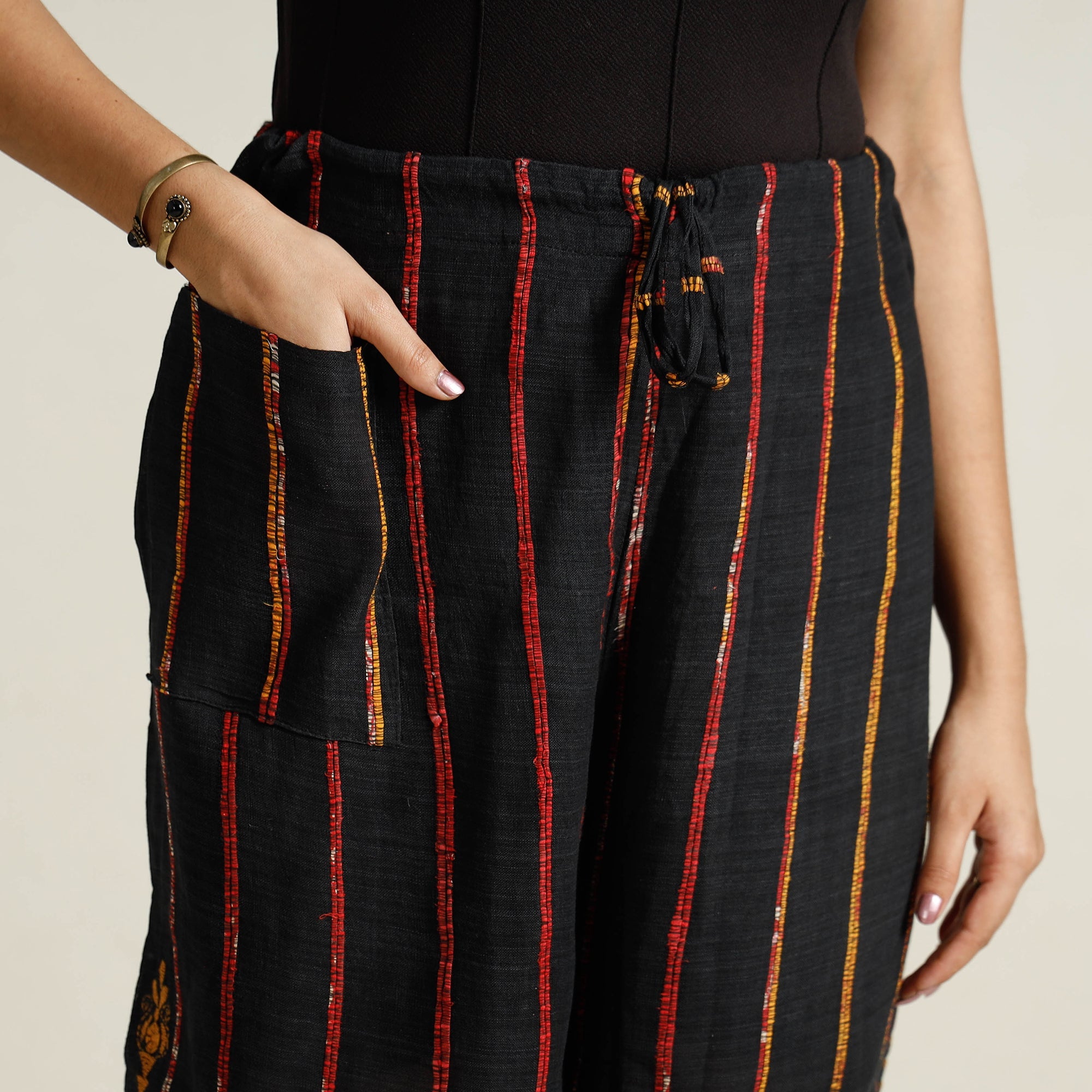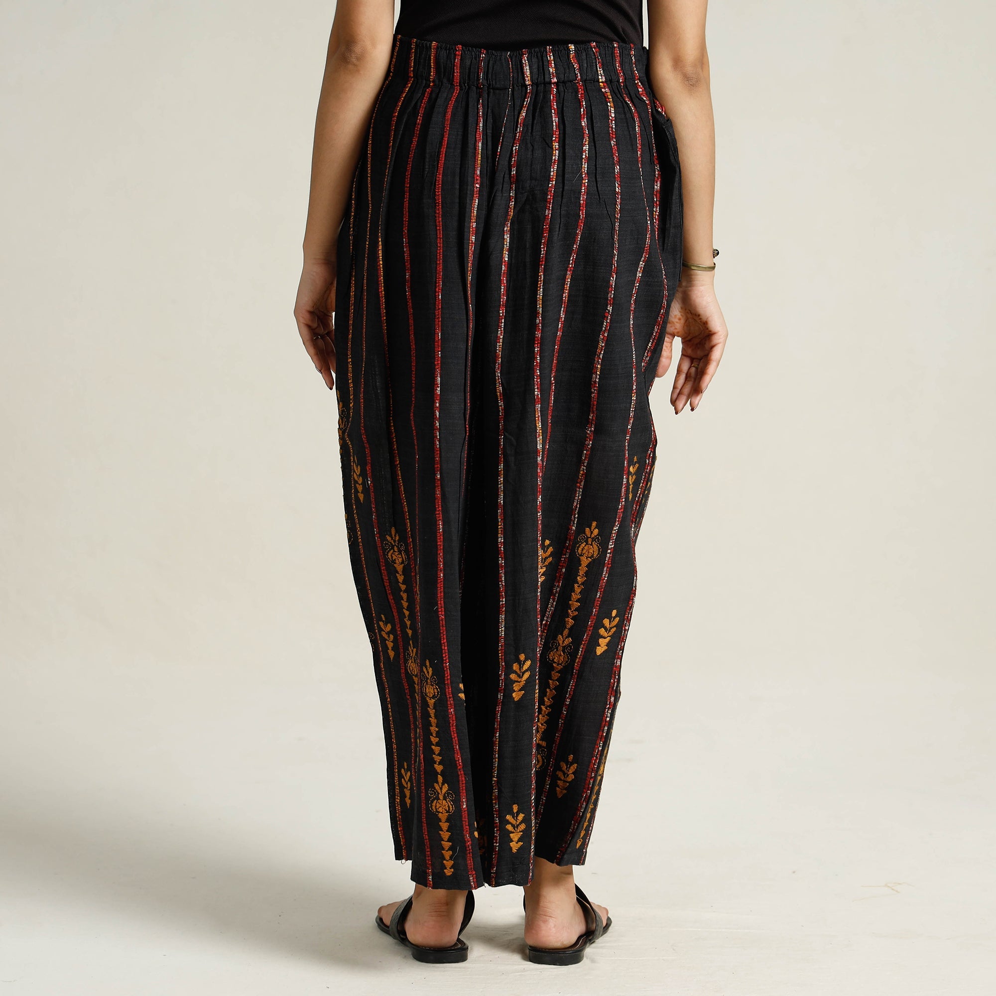Elevate your style with this stunning black bengal khesh weaving kantha embroidery cotton palazzo from West Bengal. Made from cotton, this palazzo is designed with khesh weaving and hand embroidered using West Bengal's traditional craft technique of Kantha. Khesh weaving has new thread in the warp and thin strips of sarees are used in the weft.