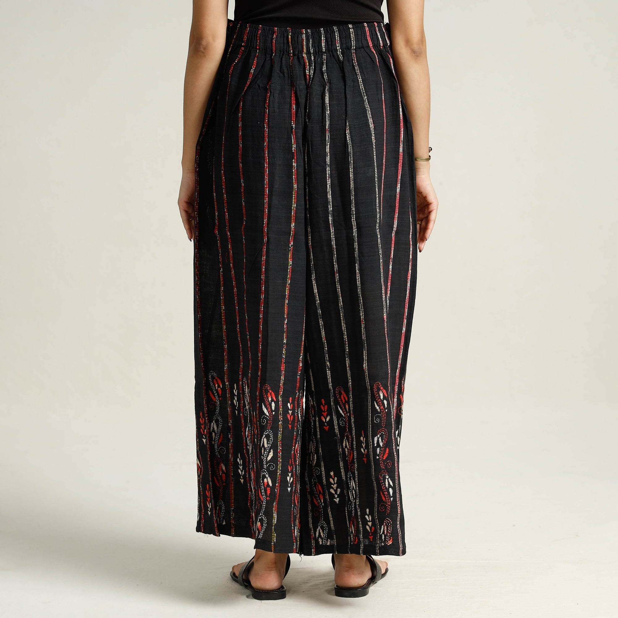 Elevate your style with this stunning black bengal khesh weaving kantha embroidery cotton palazzo from West Bengal. Made from cotton, this palazzo is designed with khesh weaving and hand embroidered using West Bengal's traditional craft technique of Kantha. Khesh weaving has new thread in the warp and thin strips of sarees are used in the weft.
