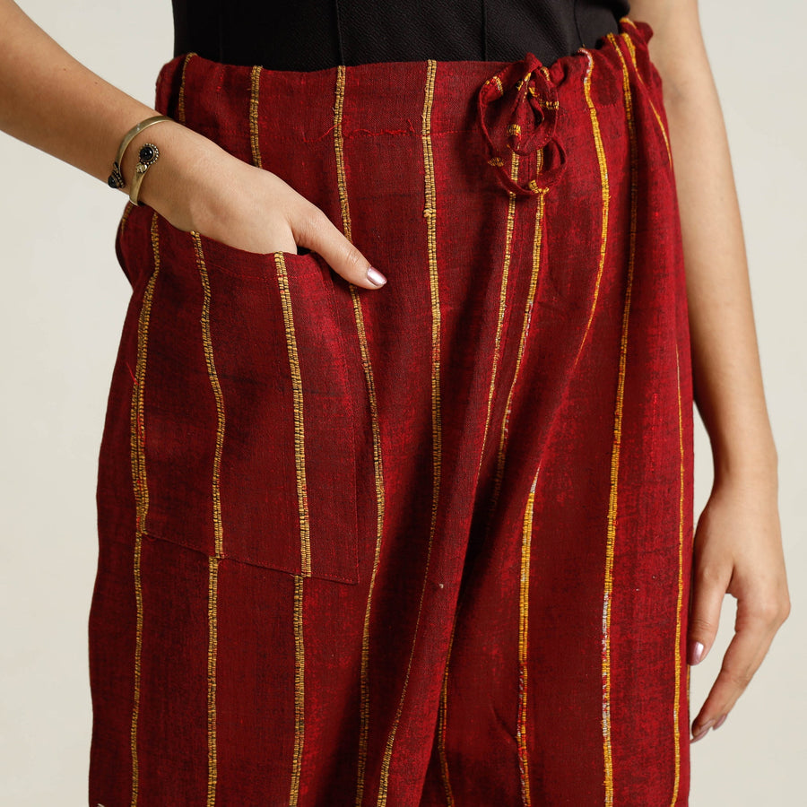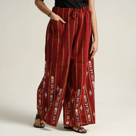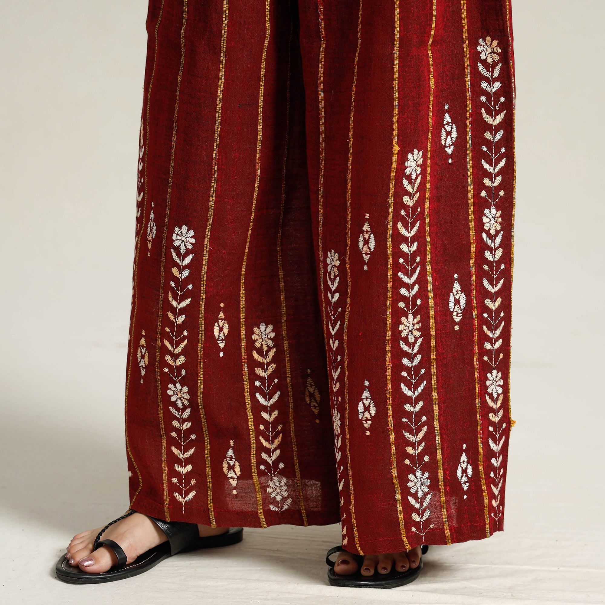 Elevate your style with this stunning red bengal khesh weaving kantha embroidery cotton palazzo from West Bengal. Made from cotton, this palazzo is designed with khesh weaving and hand embroidered using West Bengal's traditional craft technique of Kantha. Khesh weaving has new thread in the warp and thin strips of sarees are used in the weft.