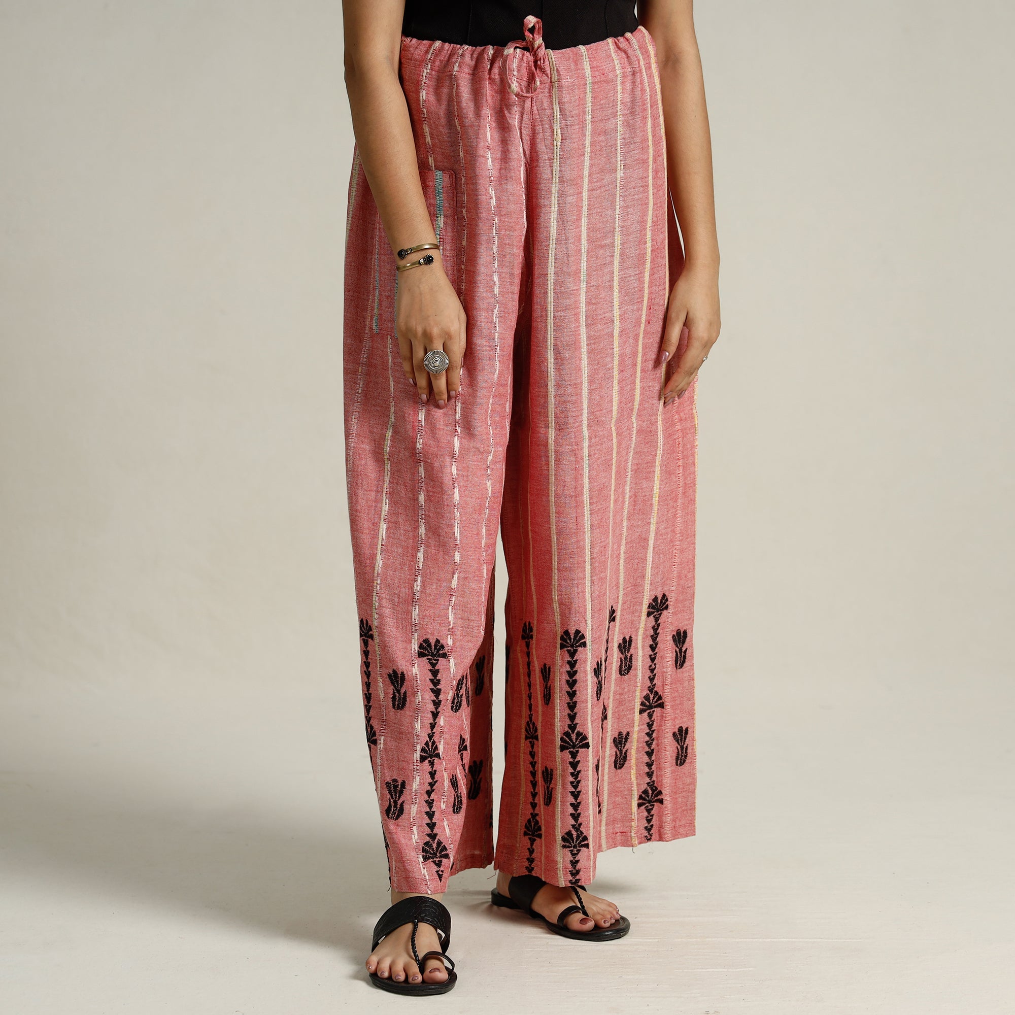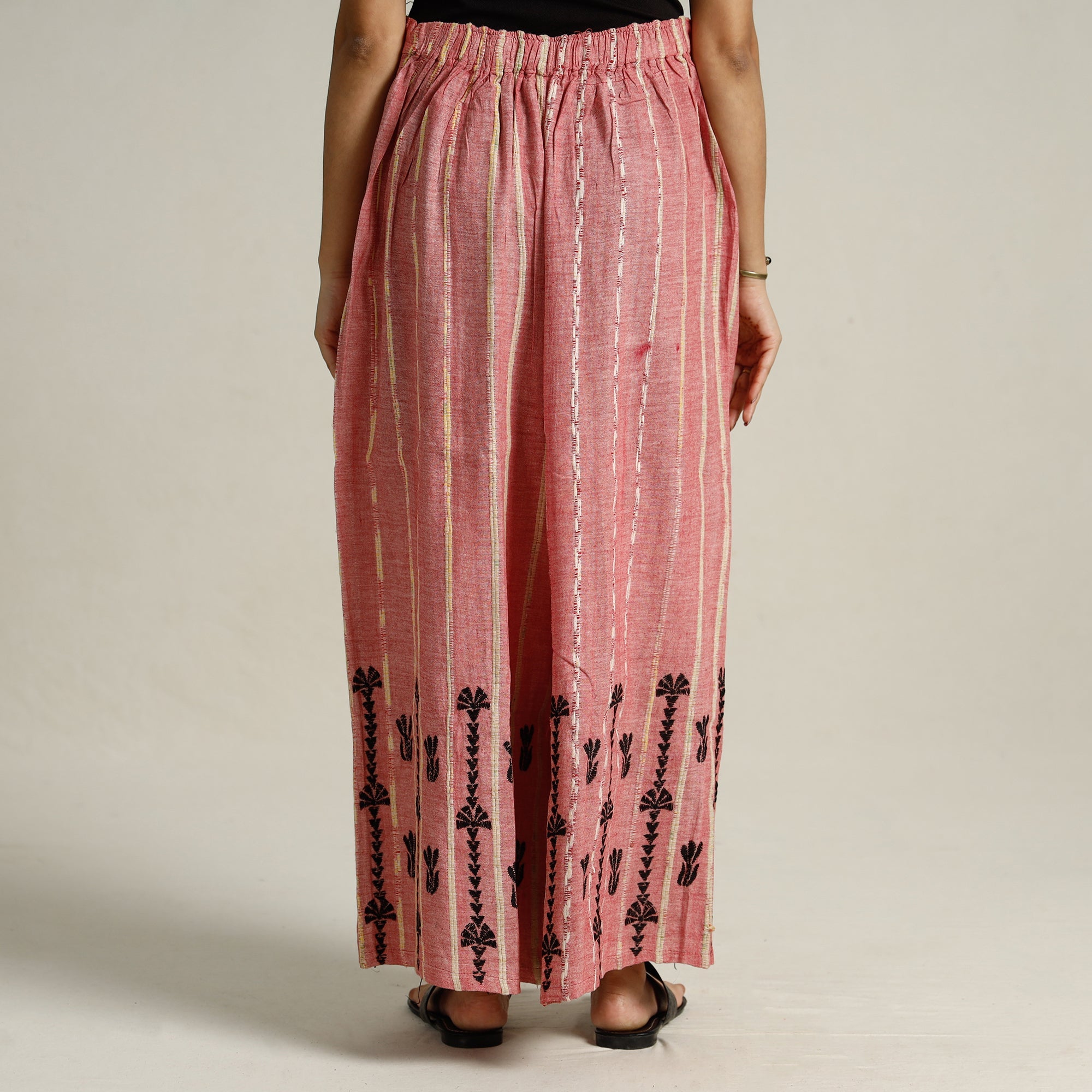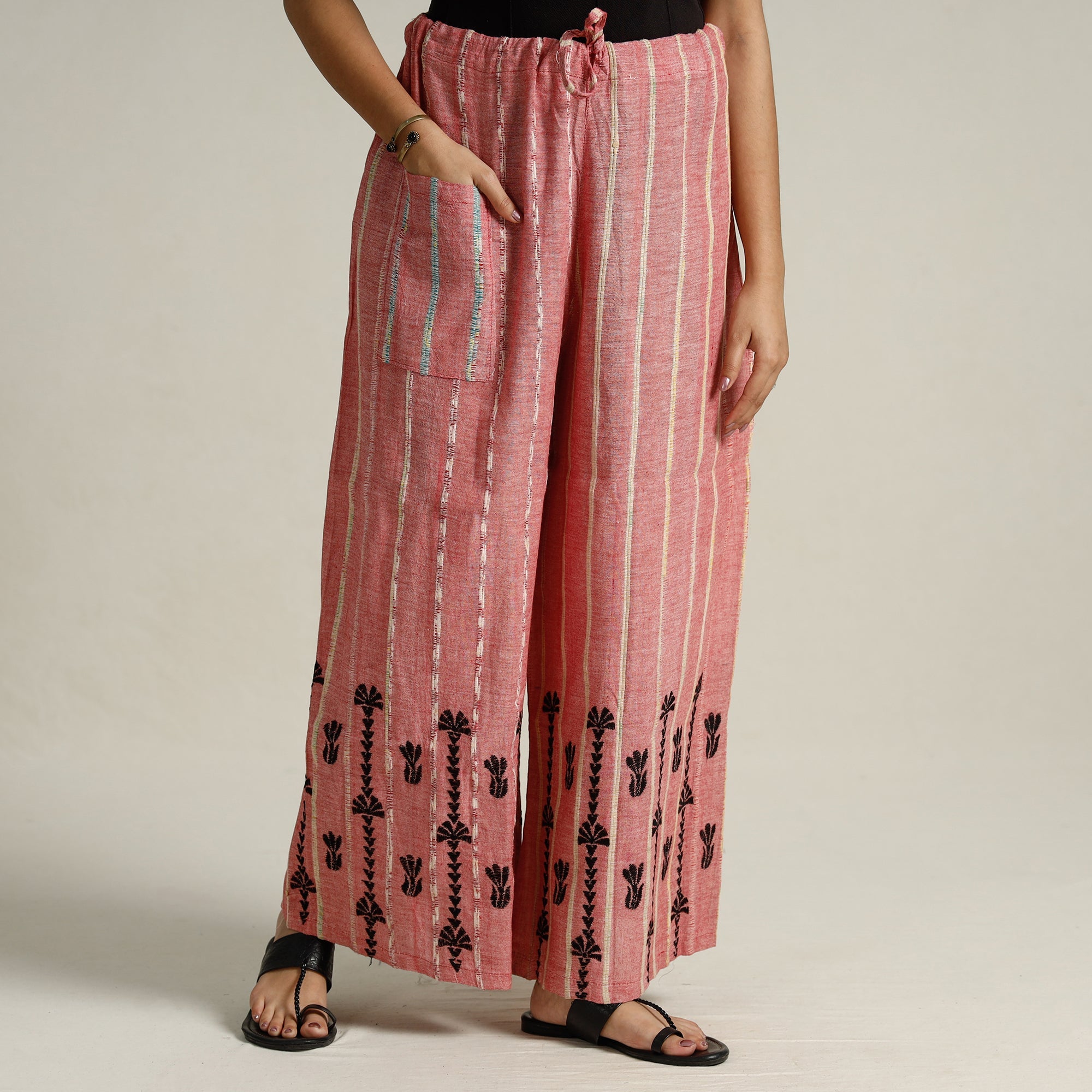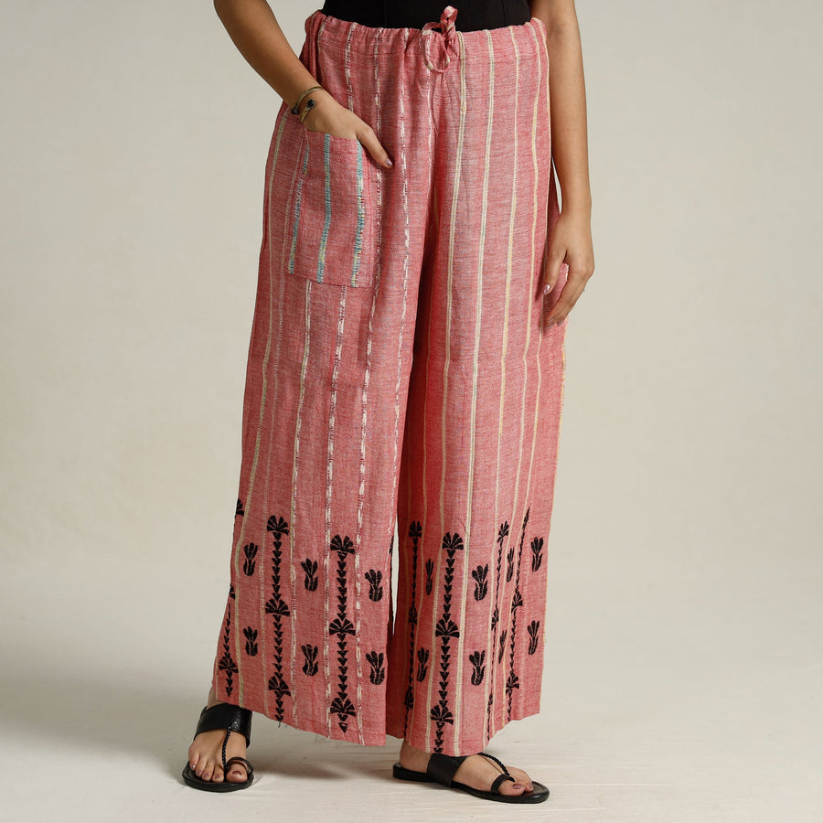 Elevate your style with this stunning pink bengal khesh weaving kantha embroidery cotton palazzo from West Bengal. Made from cotton, this palazzo is designed with khesh weaving and hand embroidered using West Bengal's traditional craft technique of Kantha. Khesh weaving has new thread in the warp and thin strips of sarees are used in the weft.