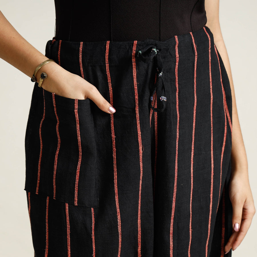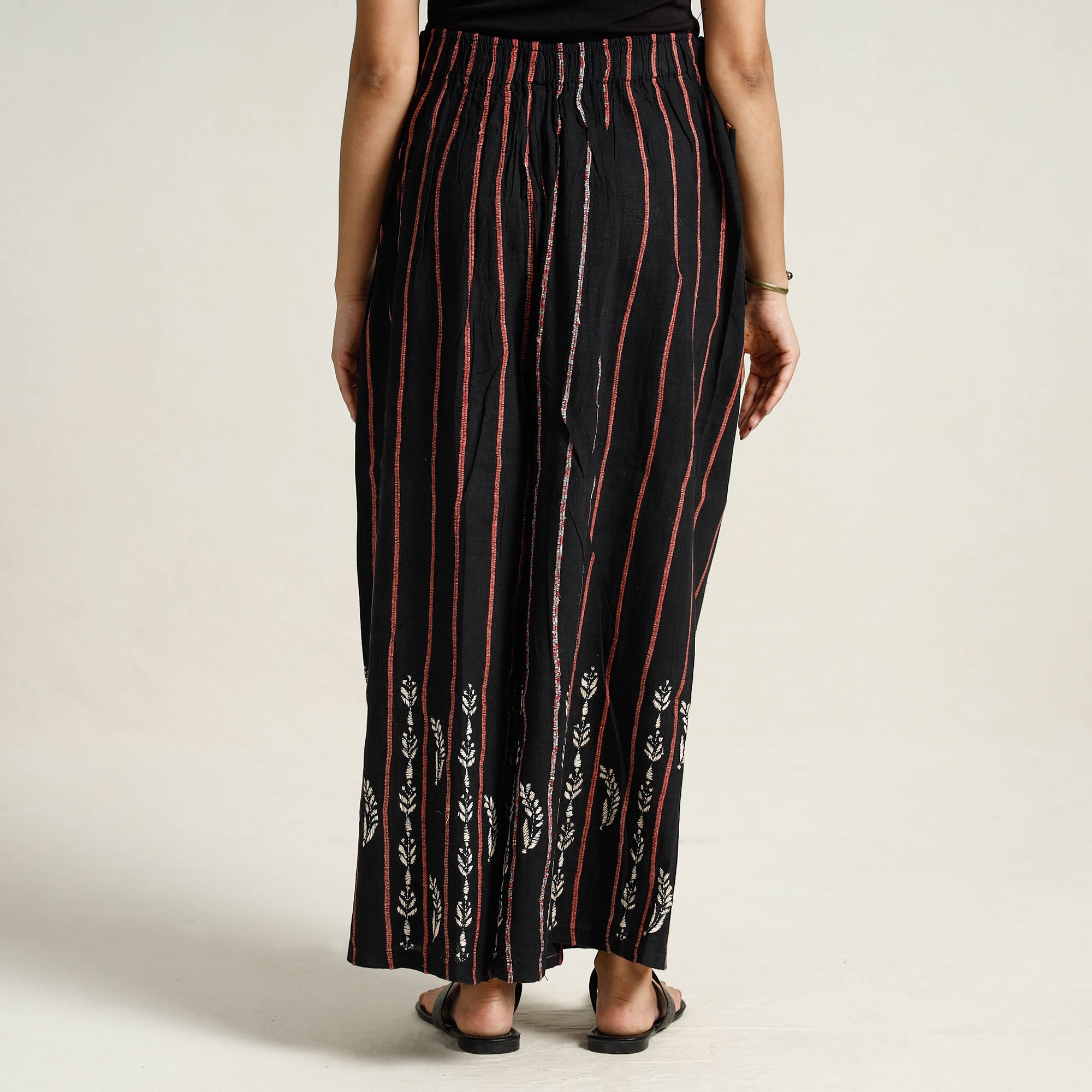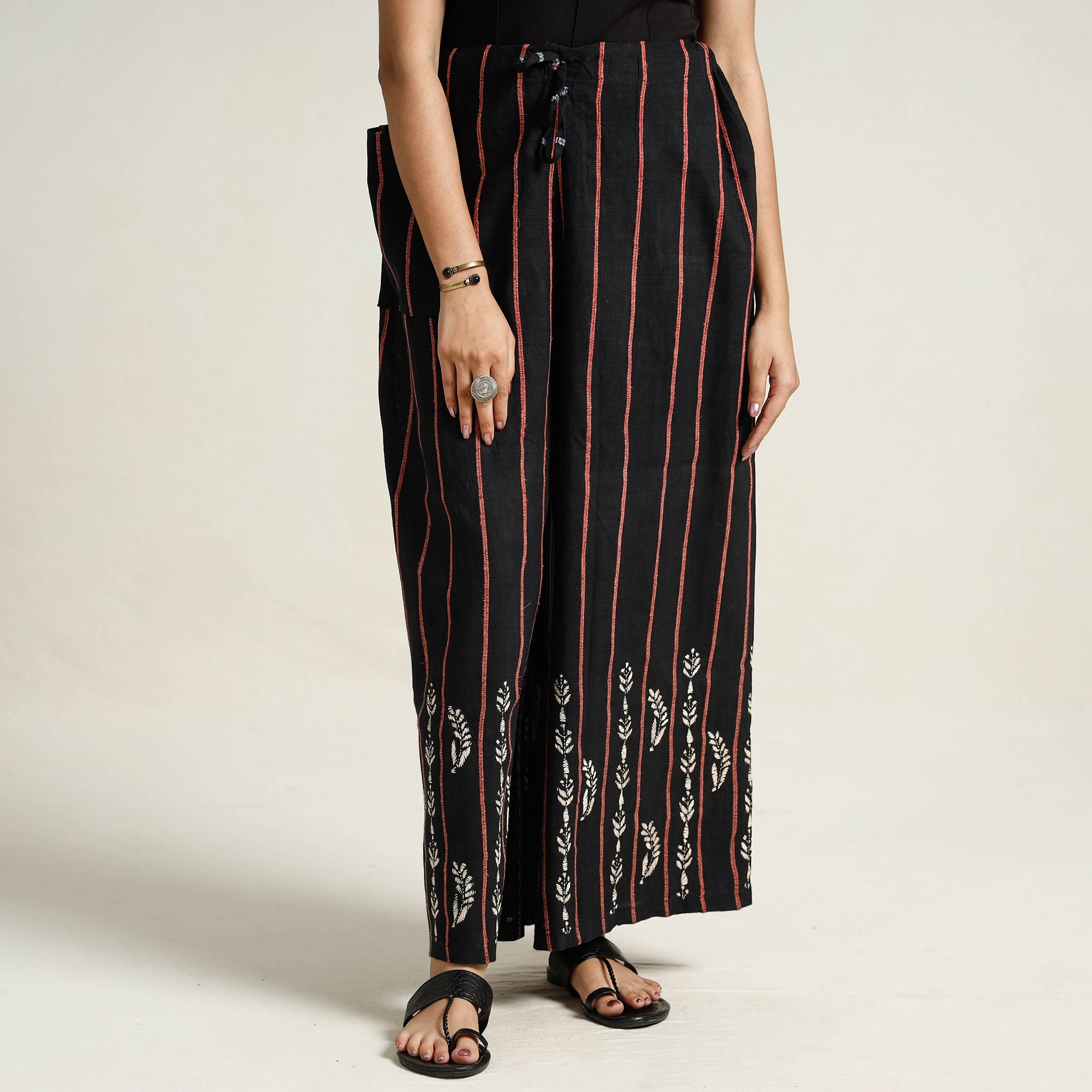 | Material | Elevate your style with this stunning black bengal khesh weaving kantha embroidery cotton palazzo from West Bengal. Made from cotton, this palazzo is designed with khesh weaving and hand embroidered using West Bengal's traditional craft technique of Kantha. Khesh weaving has new thread in the warp and thin strips of sarees are used in the weft. |