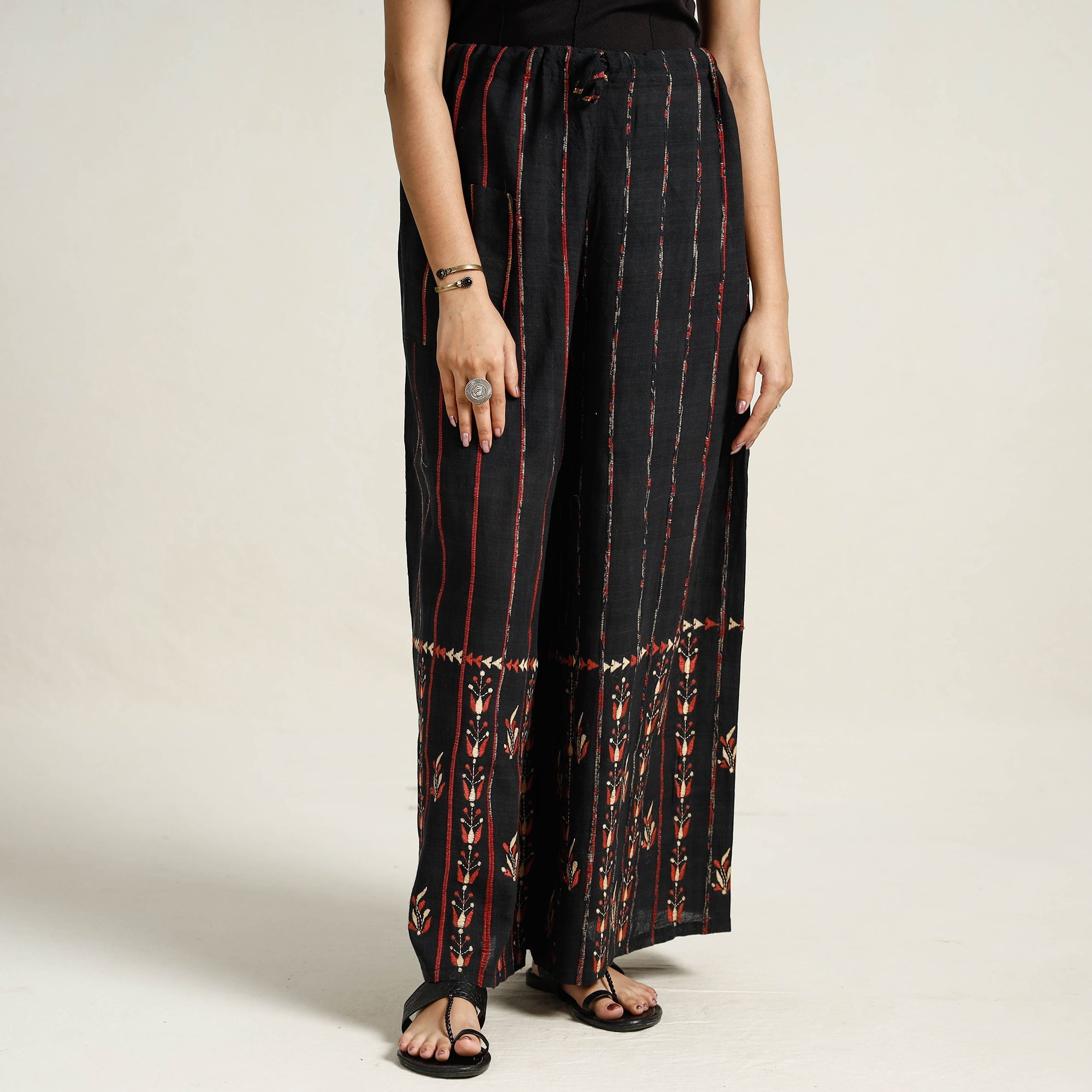 Elevate your style with this stunning black bengal khesh weaving kantha embroidery cotton palazzo from West Bengal. Made from cotton, this palazzo is designed with khesh weaving and hand embroidered using West Bengal's traditional craft technique of Kantha. Khesh weaving has new thread in the warp and thin strips of sarees are used in the weft.