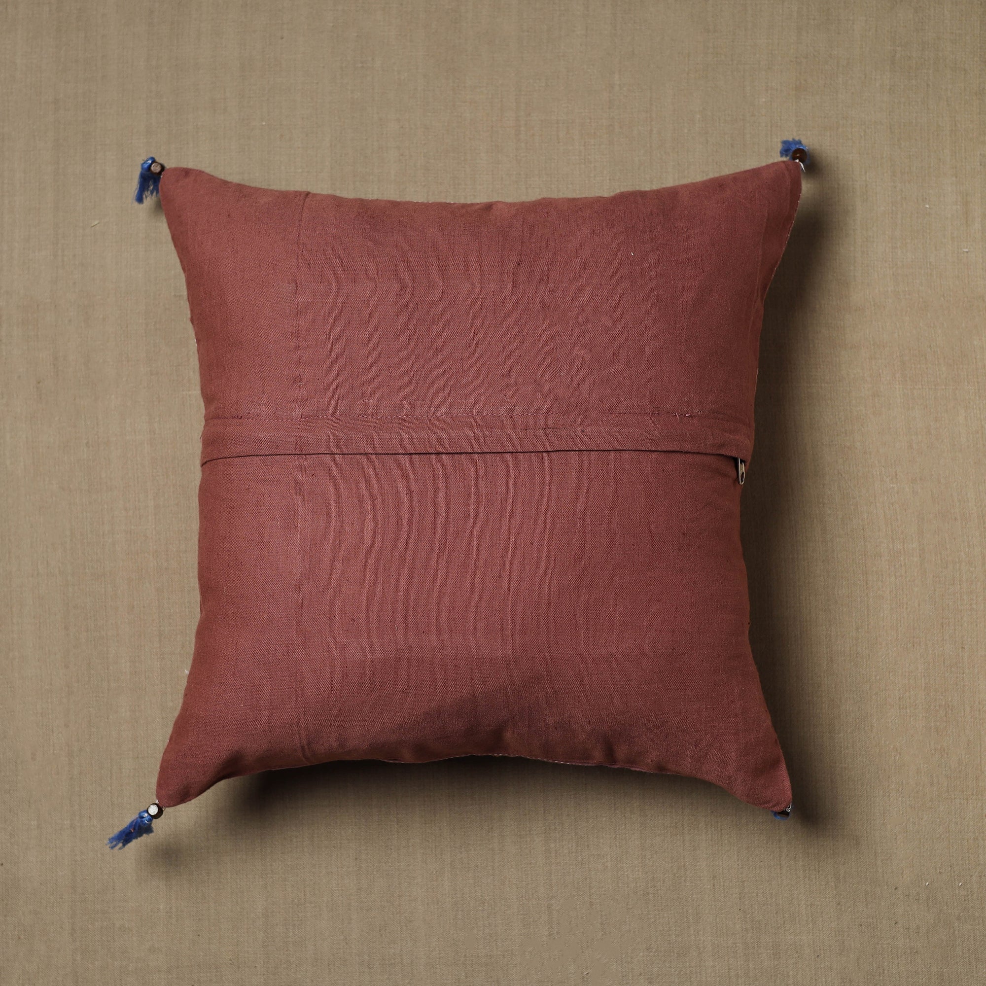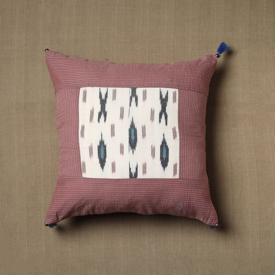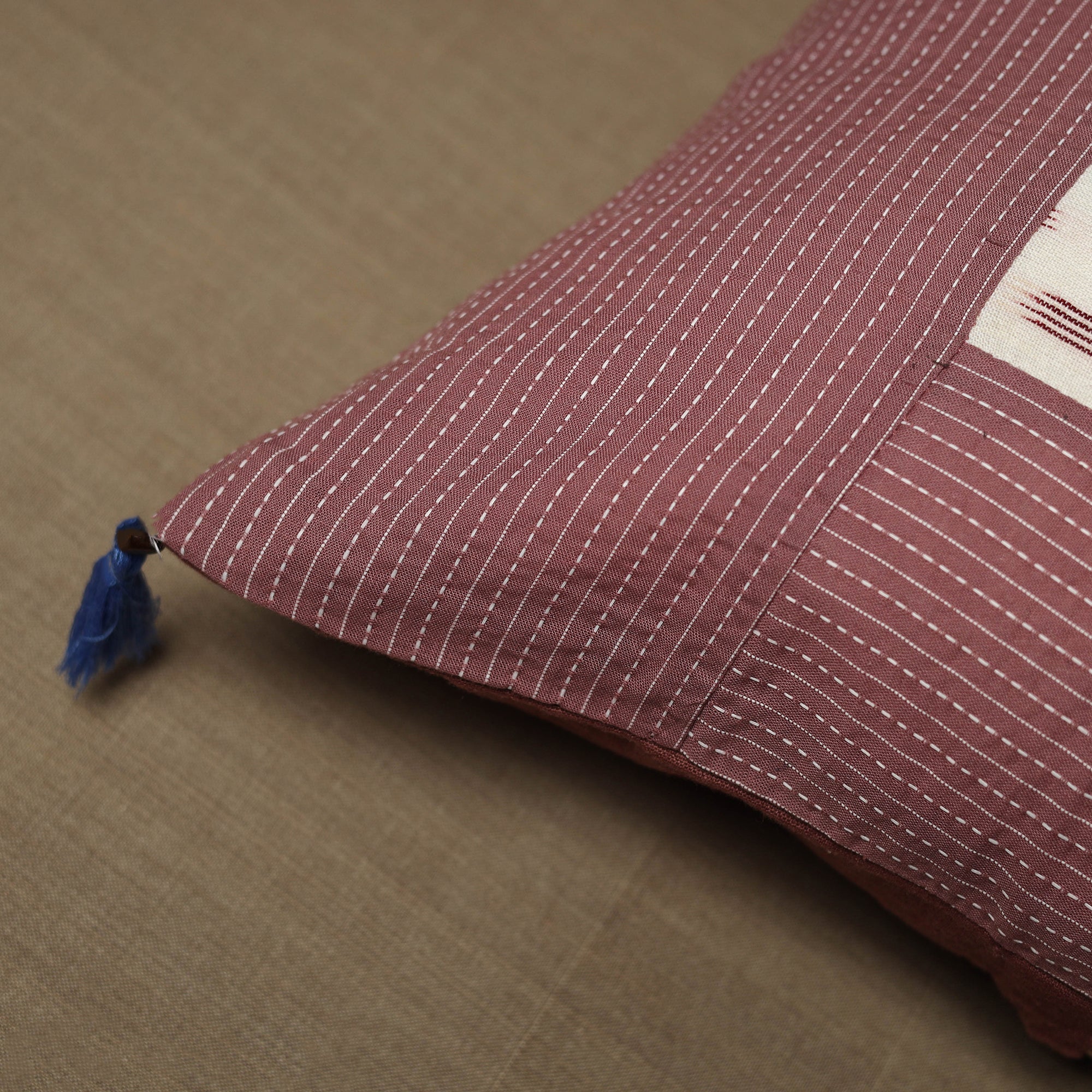 Brown Kantha stitch ikat cotton brown cushion cover combines intricate hand-stitched patterns and vibrant, resist-dyed Ikat fabric, creating a soft, durable, and visually striking addition to various home decor styles.