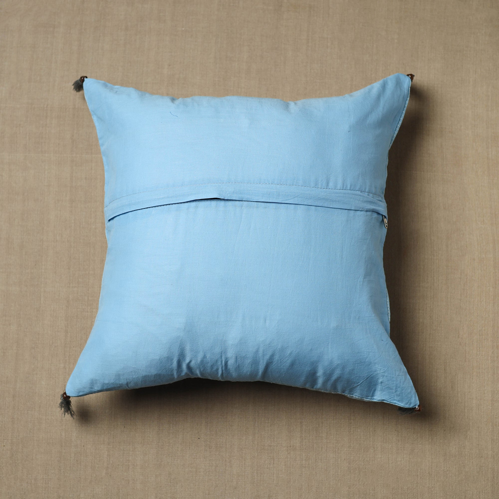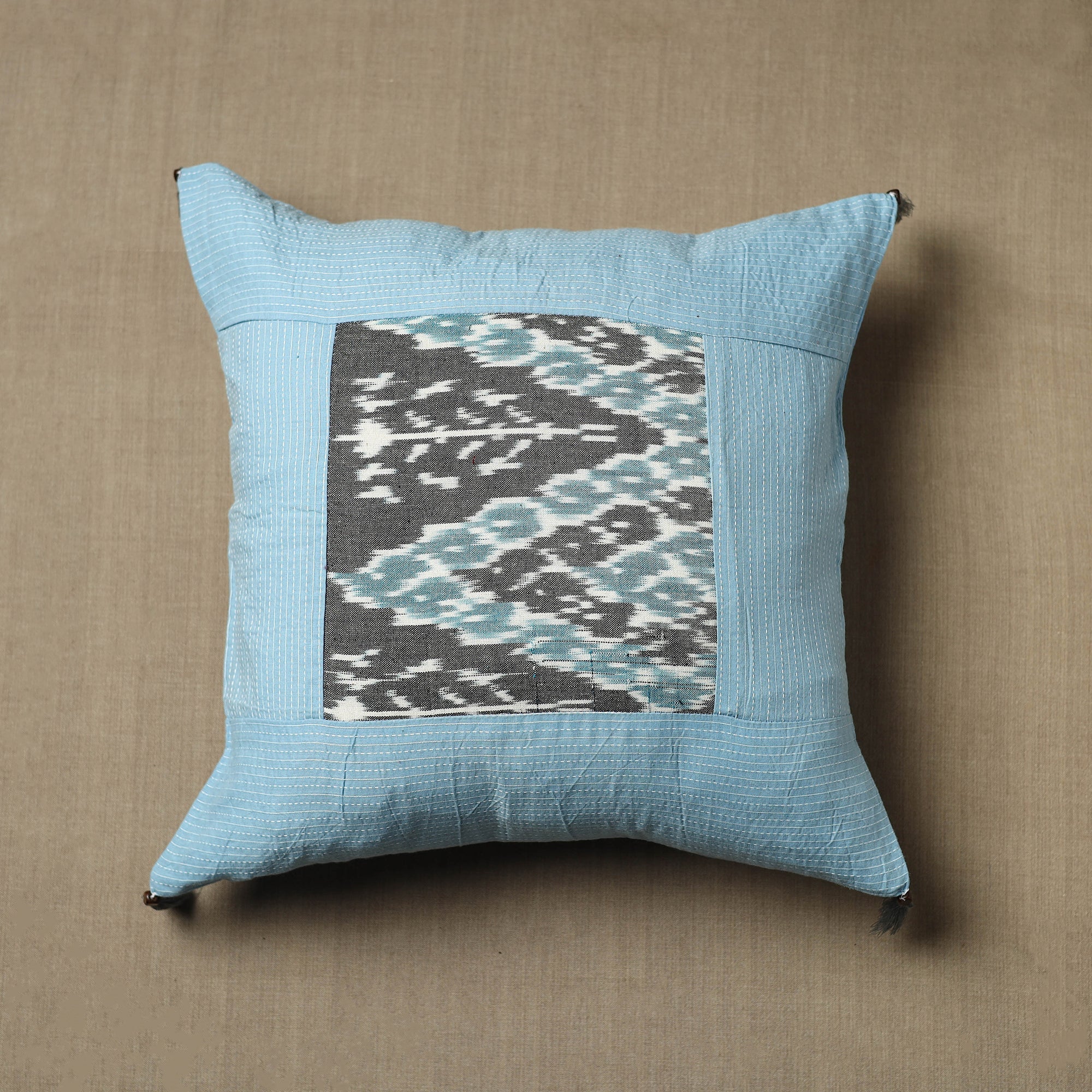 Blue kantha stitch ikat cotton cushion cover combines intricate hand-stitched patterns and vibrant, resist-dyed Ikat fabric, creating a soft, durable, and visually striking addition to various home decor styles.