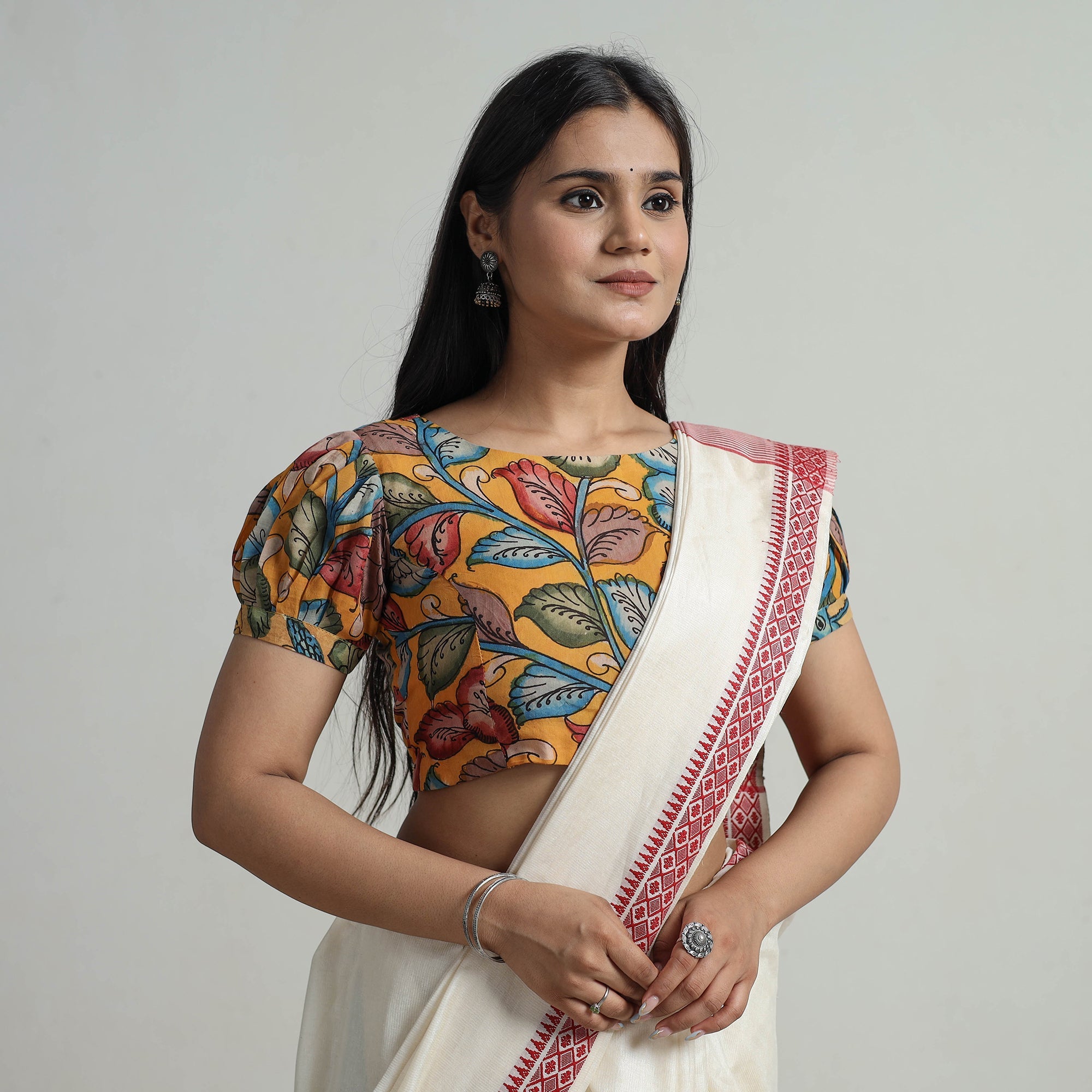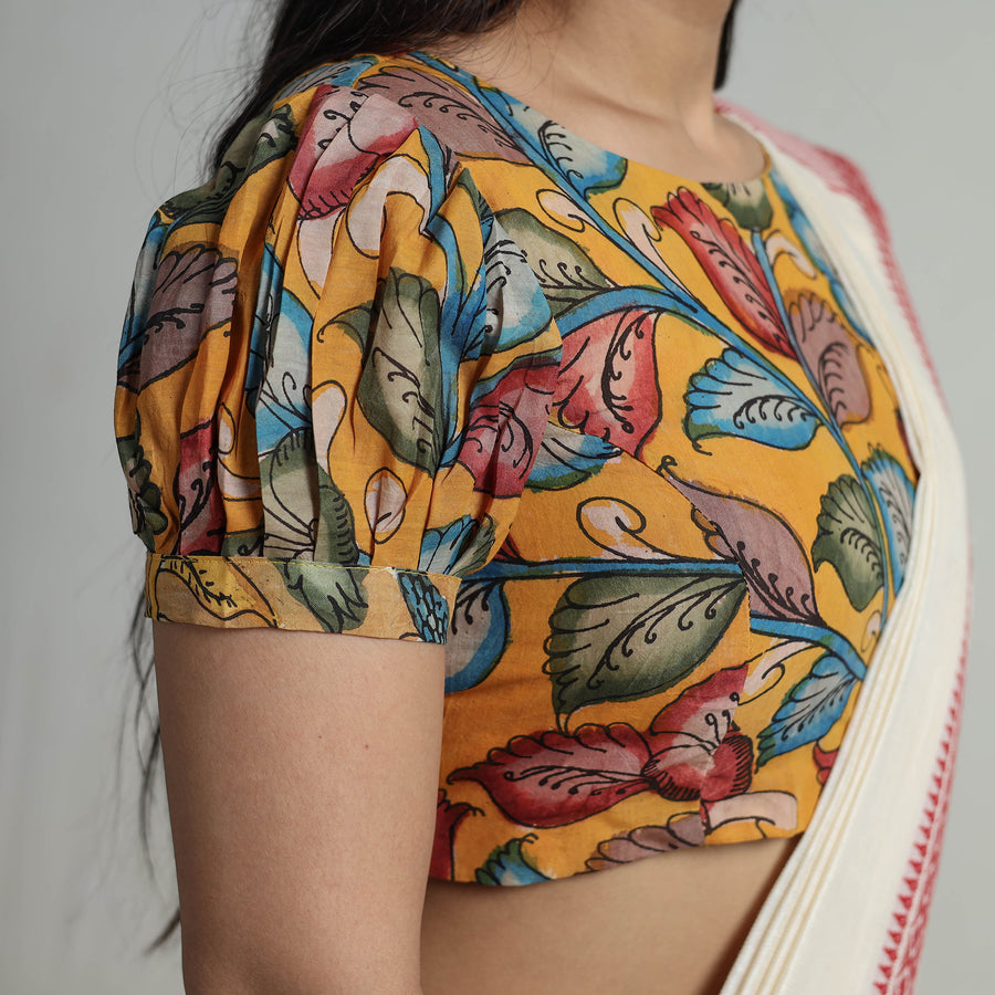 This srikalahasti handpainted penwork kalamkari chanderi silk blouse is seamlessly stitched with padded comfort for a relaxed fit. Crafted from chanderi silk fabric known for its gossamer looks and amazing feel. It features a side zipper lock and half sleeves that provide balanced coverage, making it perfect for any occasion.