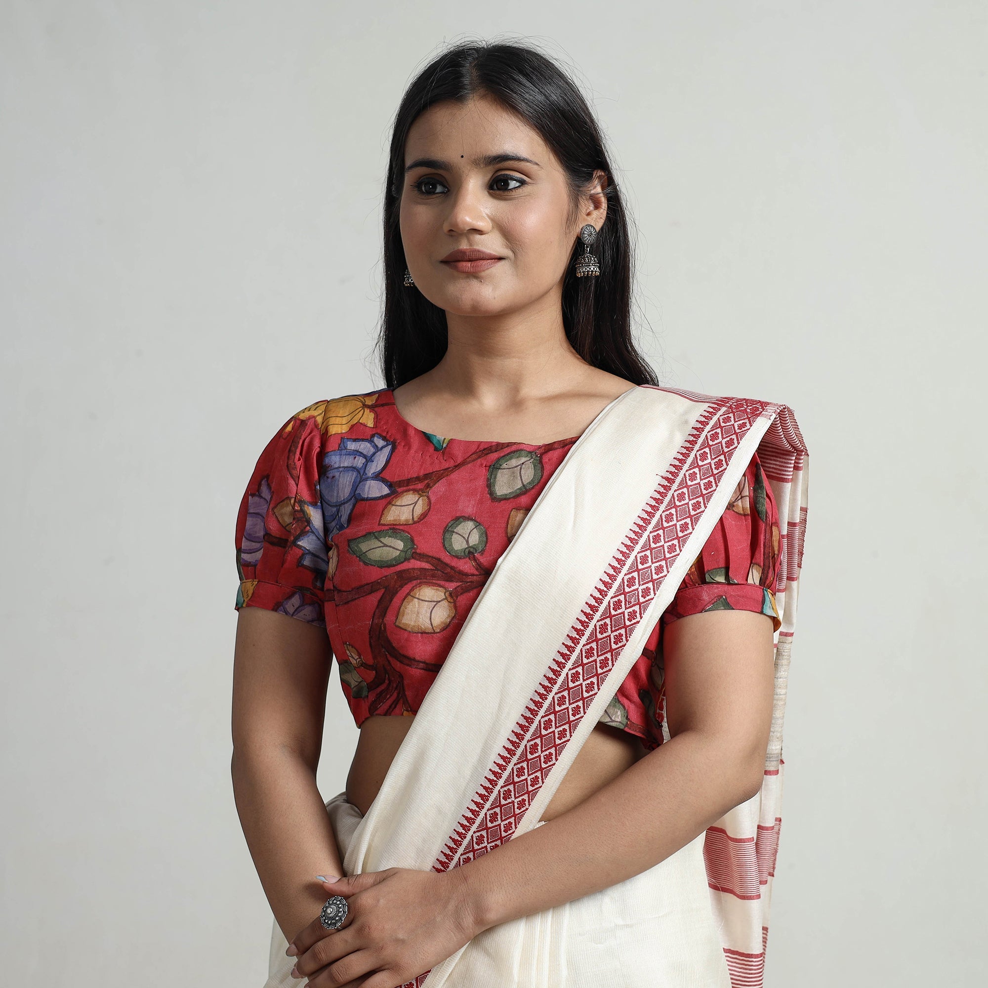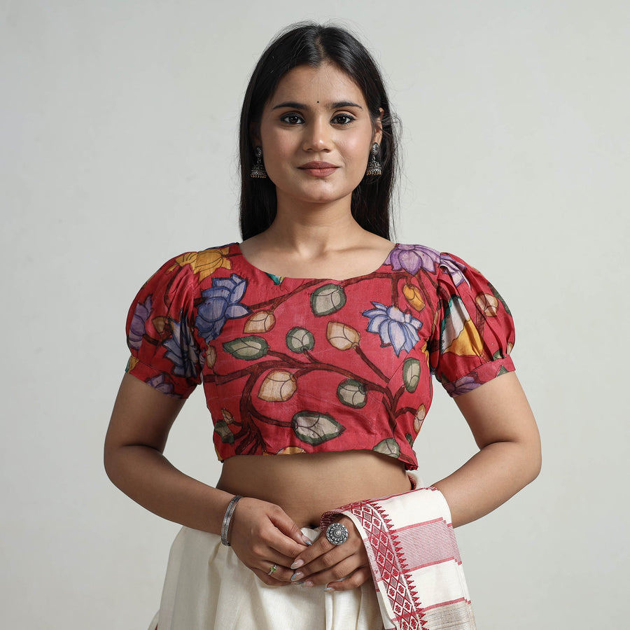 This srikalahasti handpainted penwork kalamkari chanderi silk blouse is seamlessly stitched with padded comfort for a relaxed fit. Crafted from chanderi silk fabric known for its gossamer looks and amazing feel. It features a side zipper lock and half sleeves that provide balanced coverage, making it perfect for any occasion.