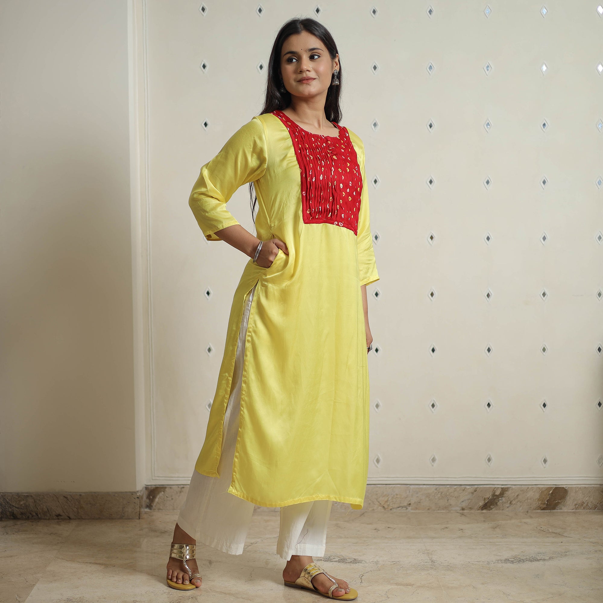 This beautiful plain modal silk straight kurta is the perfect blend of comfort and style. It boasts an exquisite bandhani pintuck patchwork design, adding a touch of elegance to your ensemble. The kurta also features a convenient one-side pocket, perfect for carrying small essentials.
