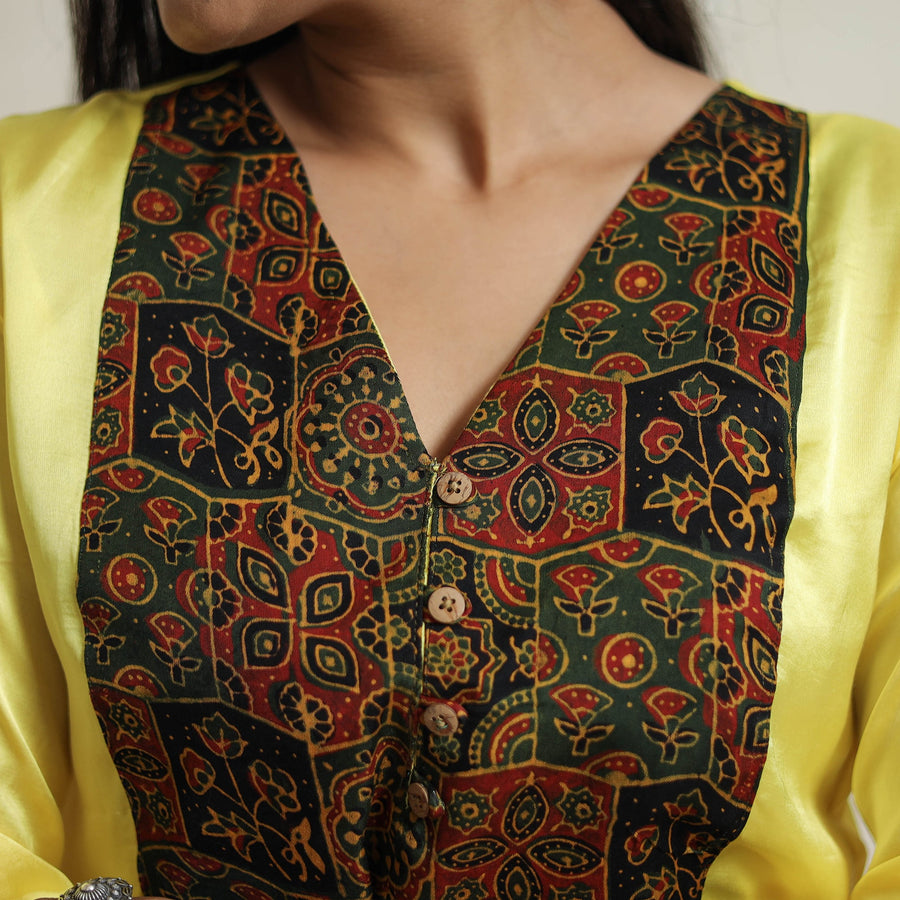 This beautiful plain modal silk a-line kurta is the perfect blend of comfort and style. It boasts an exquisite ajrakh patchwork design, adding a touch of elegance to your ensemble. The kurta also features a convenient one-side pocket, perfect for carrying small essentials.