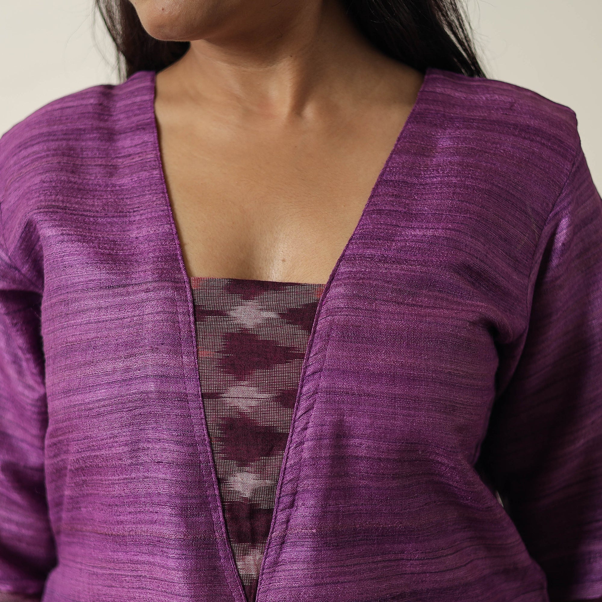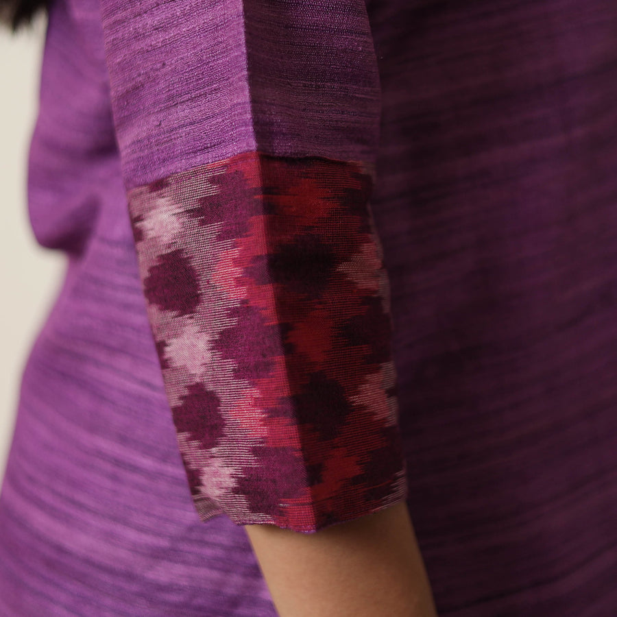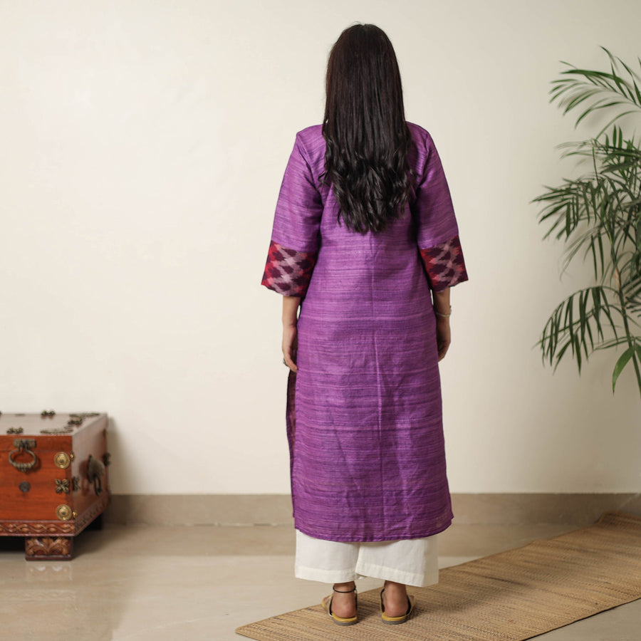 This beautiful bhagalpuri handwoven desi tussar silk straight kurta with ikat patchwork is the perfect blend of comfort and style. Tussar silk is known for its unique texture, sheen of silk, and feel of cotton. This silk kurta makes you comfortable all day long and also has a convenient one-side pocket, perfect for carrying small essentials.