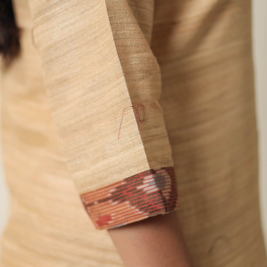 This beautiful bhagalpuri handwoven desi tussar silk straight kurta with ikat collar is the perfect blend of comfort and style. Tussar silk is known for its unique texture, sheen of silk, and feel of cotton. This silk kurta makes you comfortable all day long and also has a convenient one-side pocket, perfect for carrying small essentials.