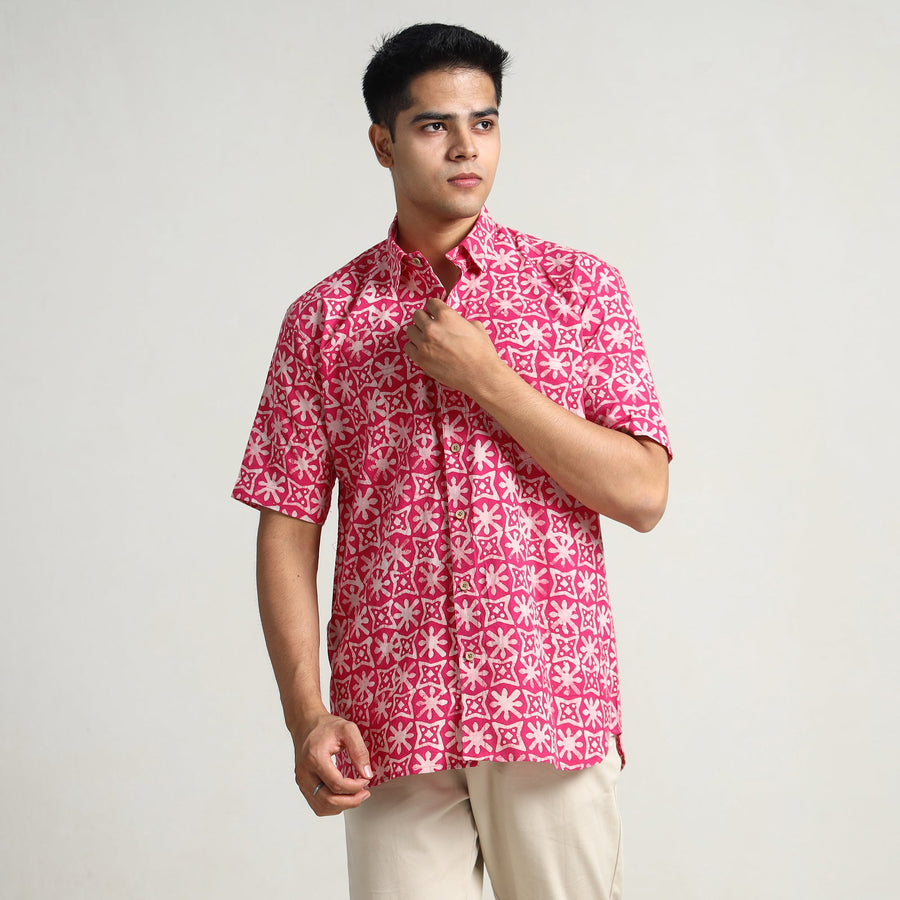 A hand batik printed cotton men's half sleeve shirt features intricate, traditional designs with vibrant colors, crafted using the wax-resist dyeing technique. It's lightweight, breathable, and perfect for casual or semi-formal wear.