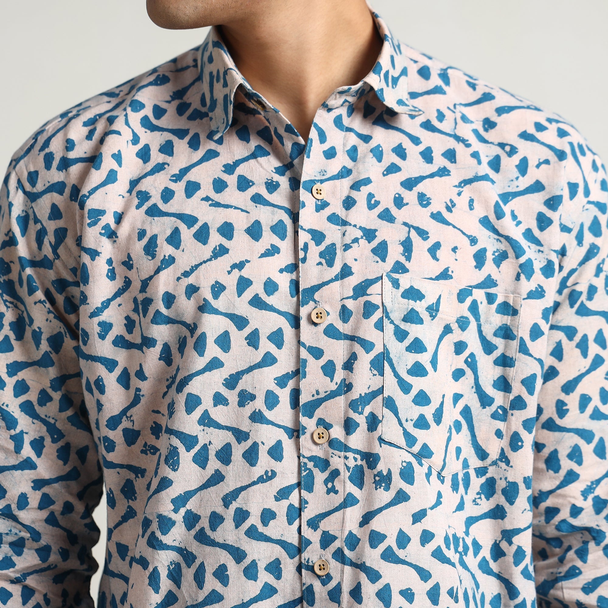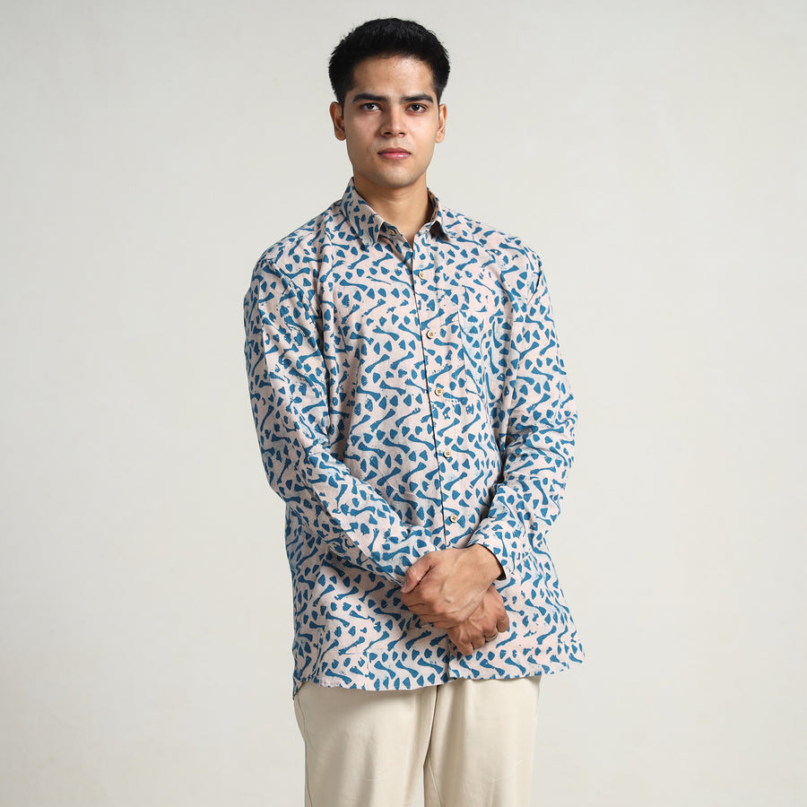 A hand batik printed cotton men's full sleeve shirt features intricate, traditional designs with vibrant colors, crafted using the wax-resist dyeing technique. It's lightweight, breathable, and perfect for casual or semi-formal wear.