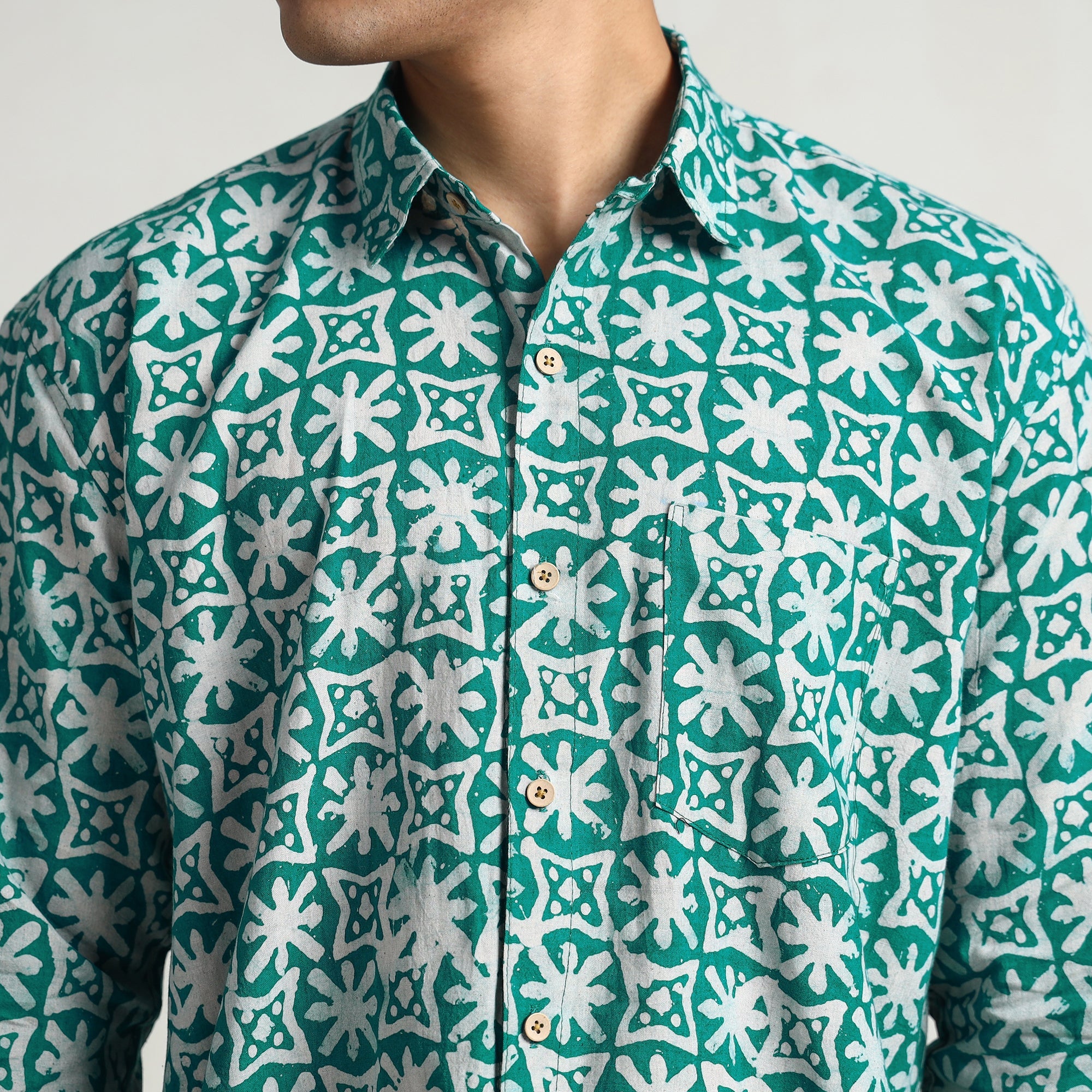 A hand batik printed cotton men's full sleeve shirt features intricate, traditional designs with vibrant colors, crafted using the wax-resist dyeing technique. It's lightweight, breathable, and perfect for casual or semi-formal wear.