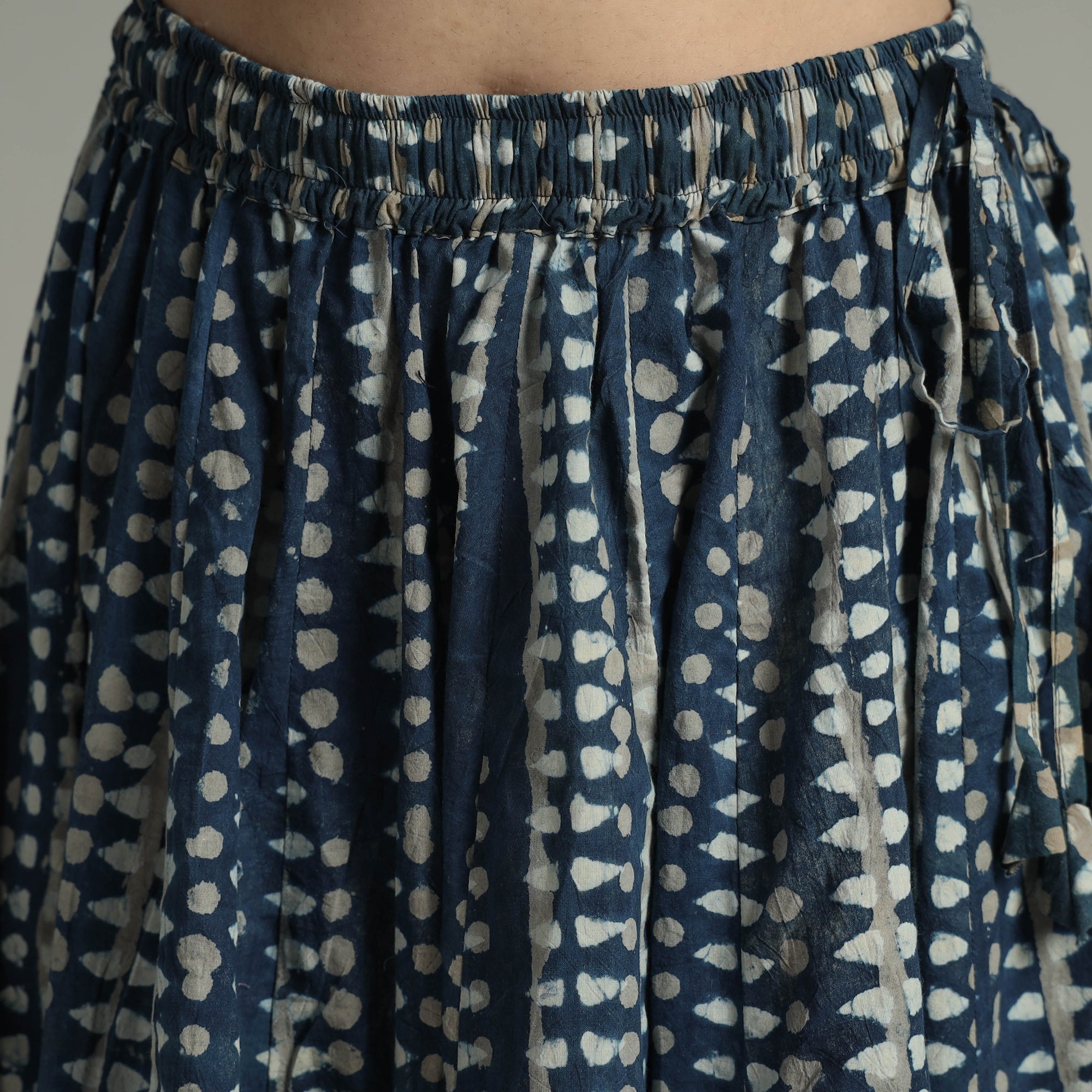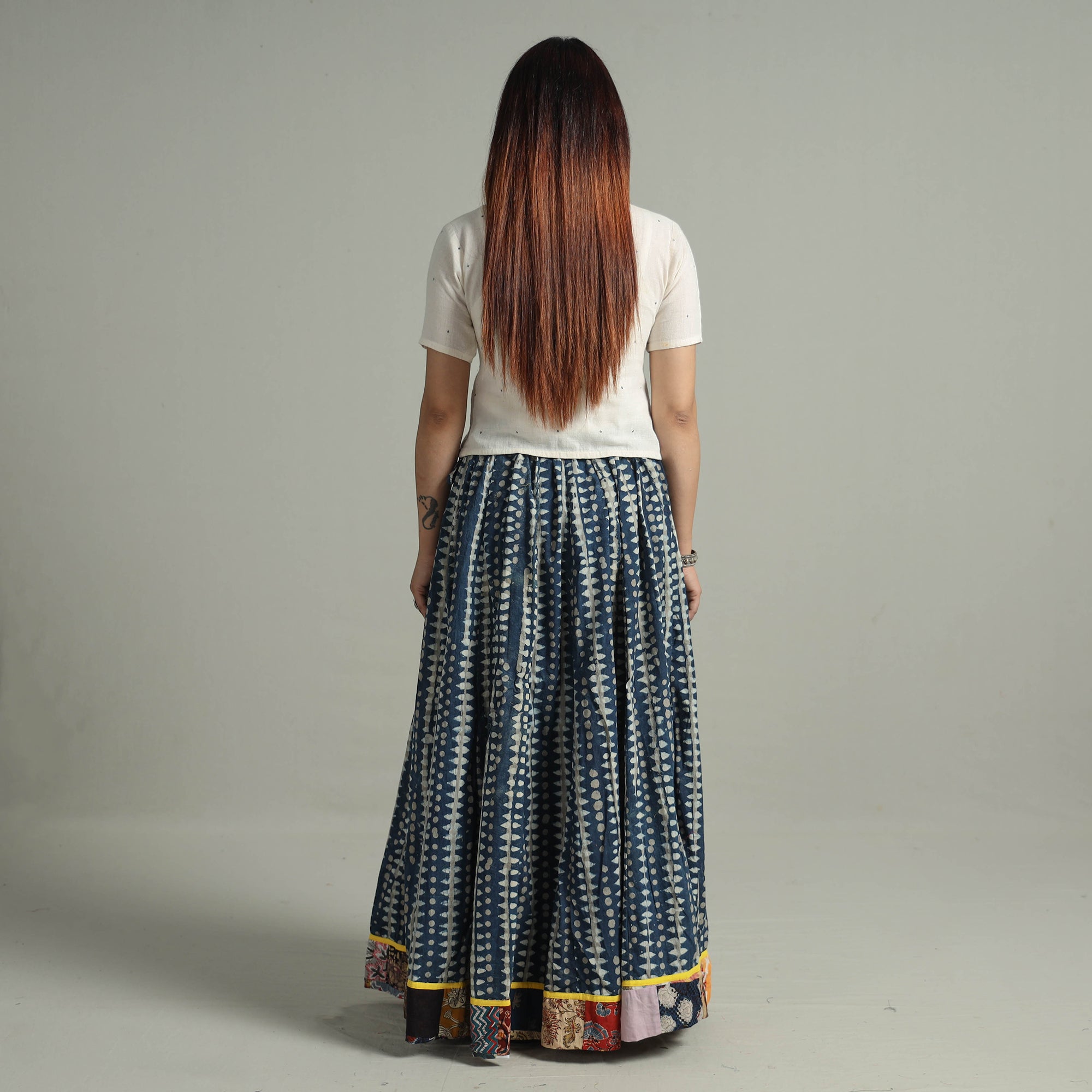Elevate your wardrobe with our patchwork long skirt, skillfully crafted from indigo block-printed cotton fabric. This skirt boasts a waist tie-up closure, allowing for a customized and comfortable fit. The patchwork 24-kali design adds a unique touch, showcasing the skilled craftsmanship behind its creation.