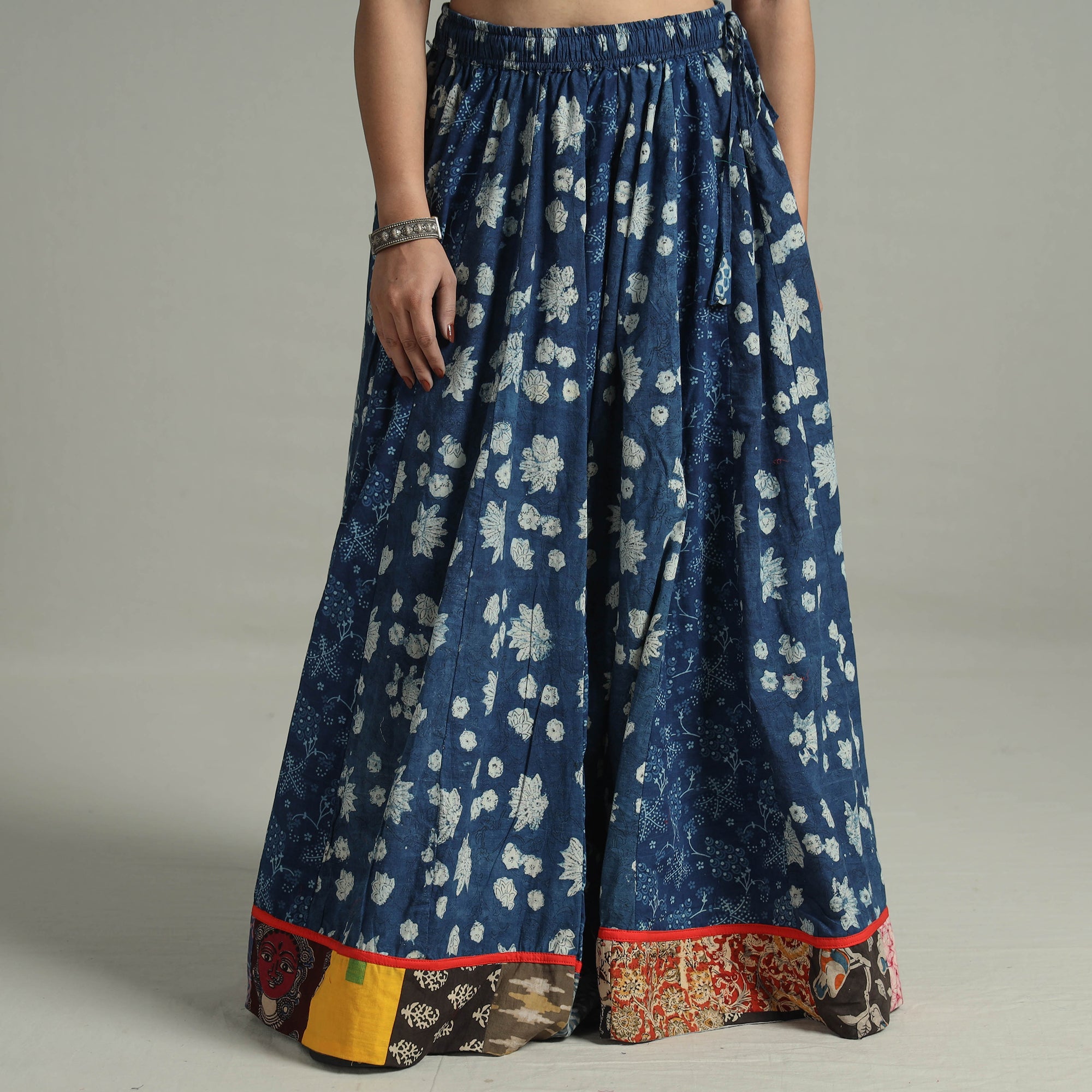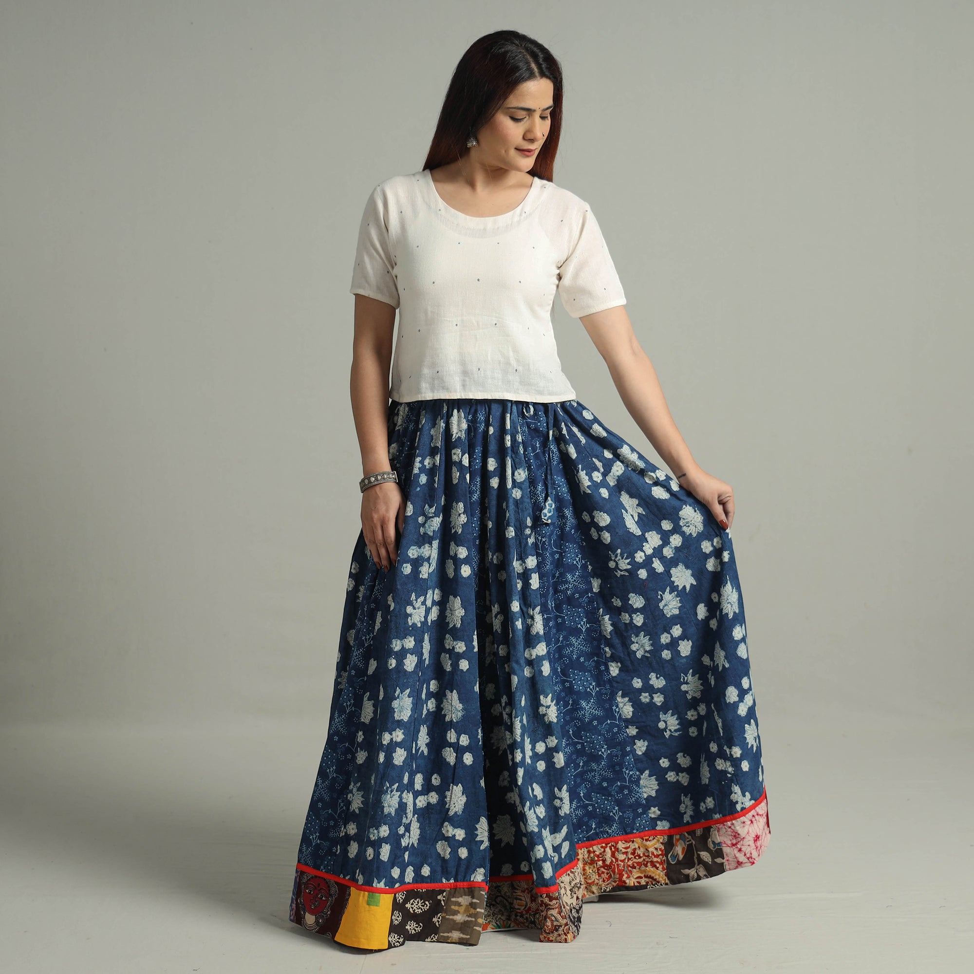 Elevate your wardrobe with our patchwork long skirt, skillfully crafted from indigo block-printed cotton fabric. This skirt boasts a waist tie-up closure, allowing for a customized and comfortable fit. The patchwork 24-kali design adds a unique touch, showcasing the skilled craftsmanship behind its creation.