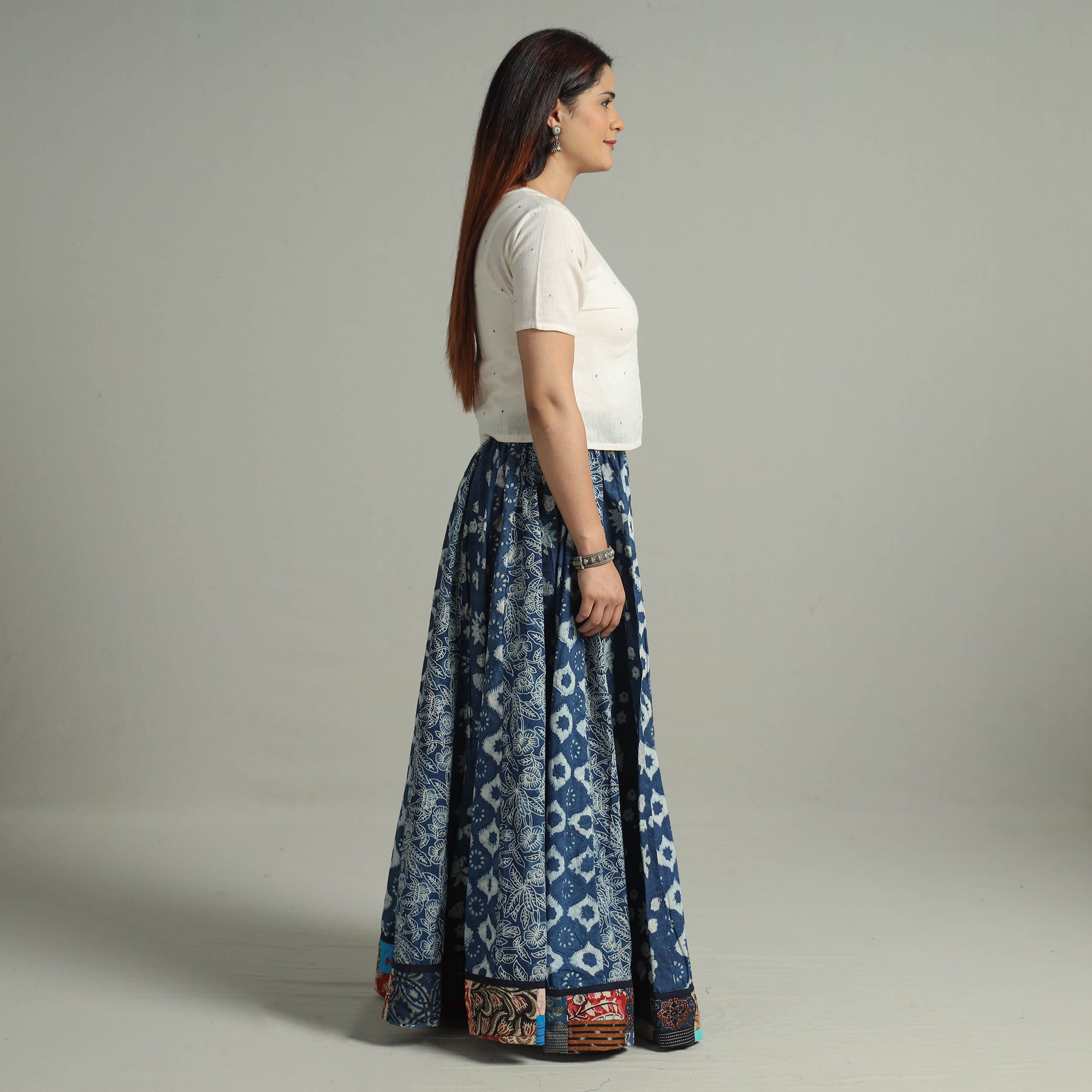 Elevate your wardrobe with our patchwork long skirt, skillfully crafted from indigo block-printed cotton fabric. This skirt boasts a waist tie-up closure, allowing for a customized and comfortable fit. The patchwork 24-kali design adds a unique touch, showcasing the skilled craftsmanship behind its creation.