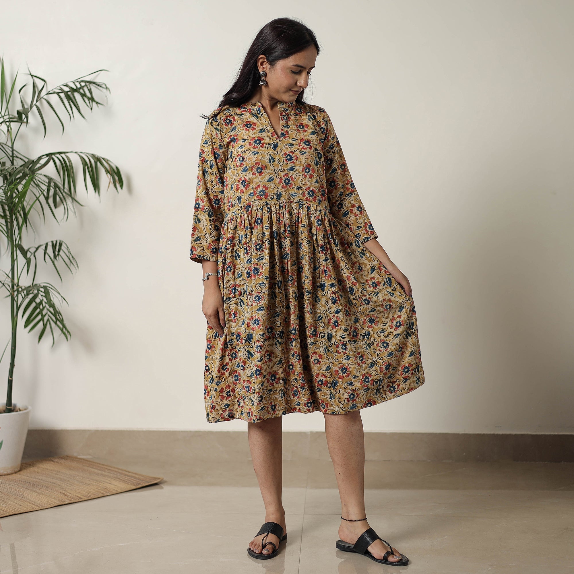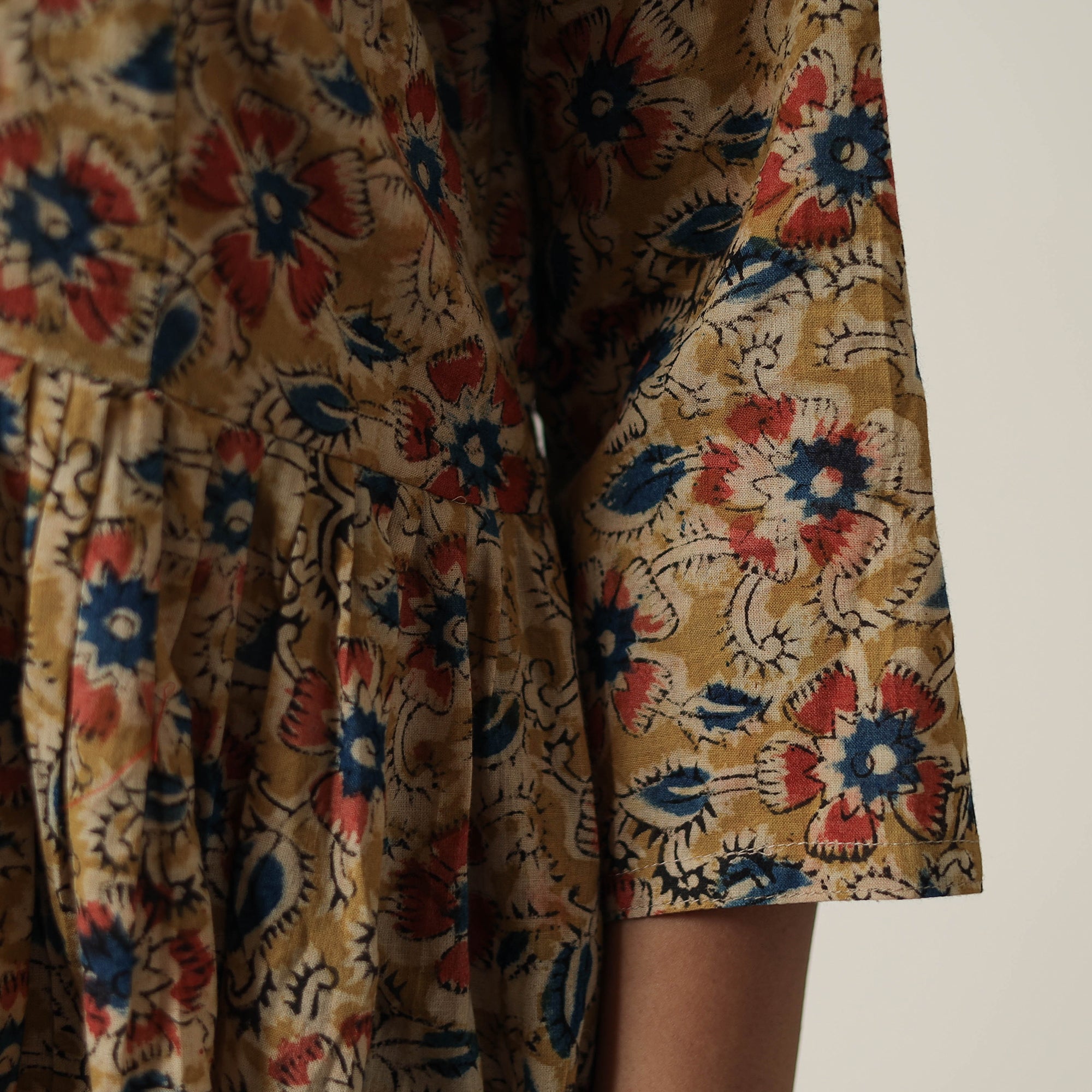 Indulge in the traditional charm of this pedana kalamkari block-printed cotton flared dress, thoughtfully designed to enhance your style. This dress is crafted from cotton fabric, ensuring a comfortable feel against your skin. This cotton dress makes you comfortable all day long.
