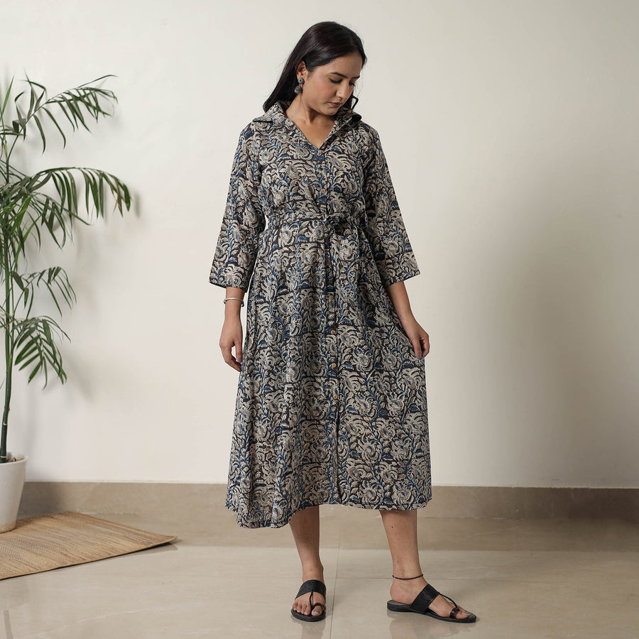 Indulge in the traditional charm of this pedana kalamkari block-printed cotton dress, thoughtfully designed to enhance your style. This dress is crafted from cotton fabric, ensuring a comfortable feel against your skin.