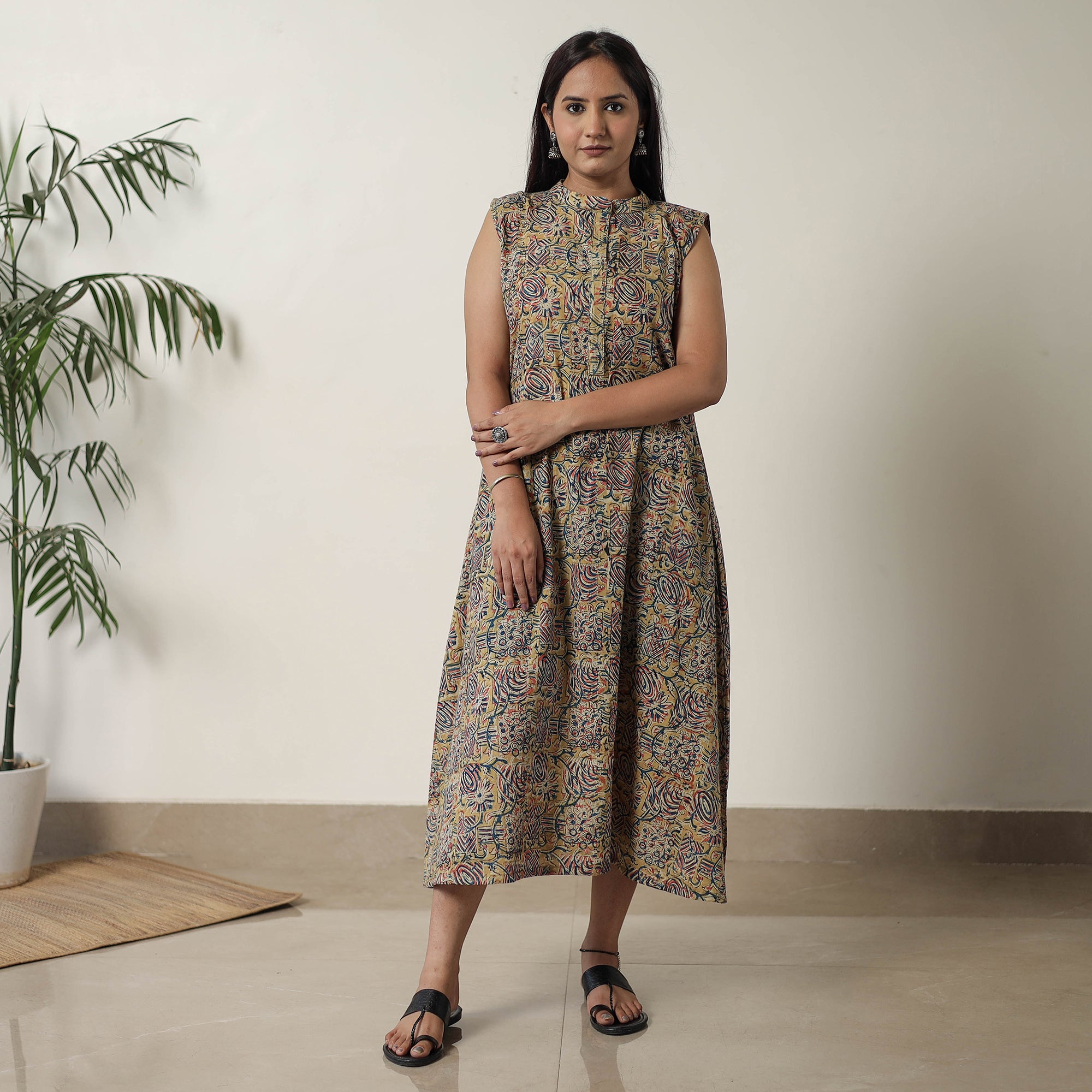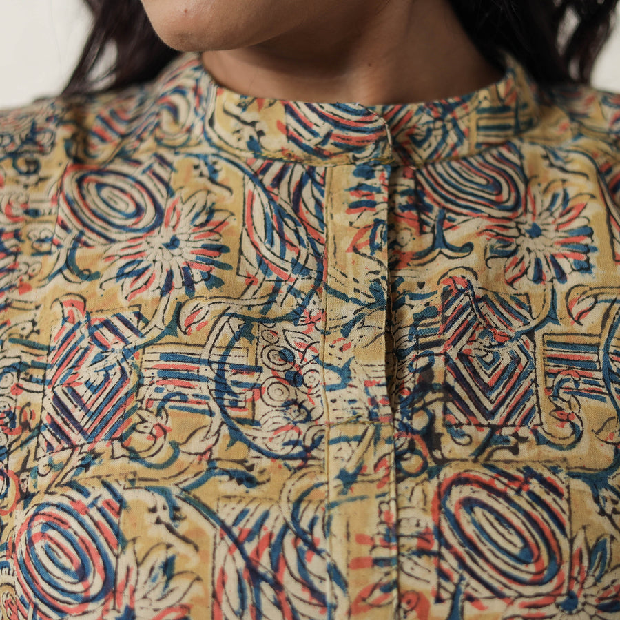 Indulge in the traditional charm of this pedana kalamkari block-printed cotton dress, thoughtfully designed to enhance your style. This dress is crafted from cotton fabric, ensuring a comfortable feel against your skin.