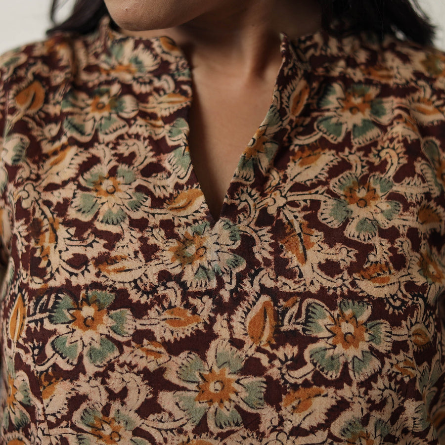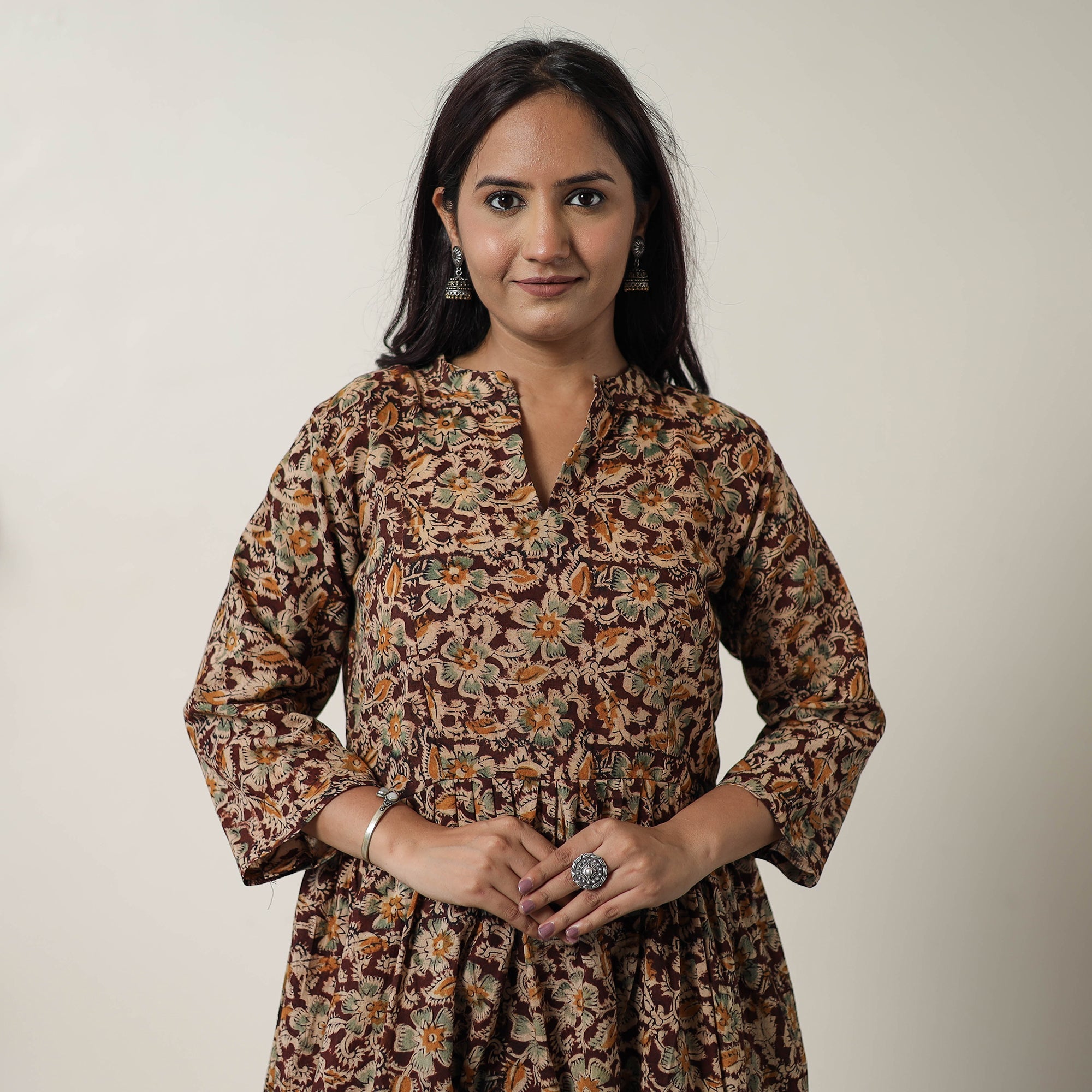 Indulge in the traditional charm of this pedana kalamkari block-printed cotton flared dress, thoughtfully designed to enhance your style. This dress is crafted from cotton fabric, ensuring a comfortable feel against your skin. This cotton dress makes you comfortable all day long.
